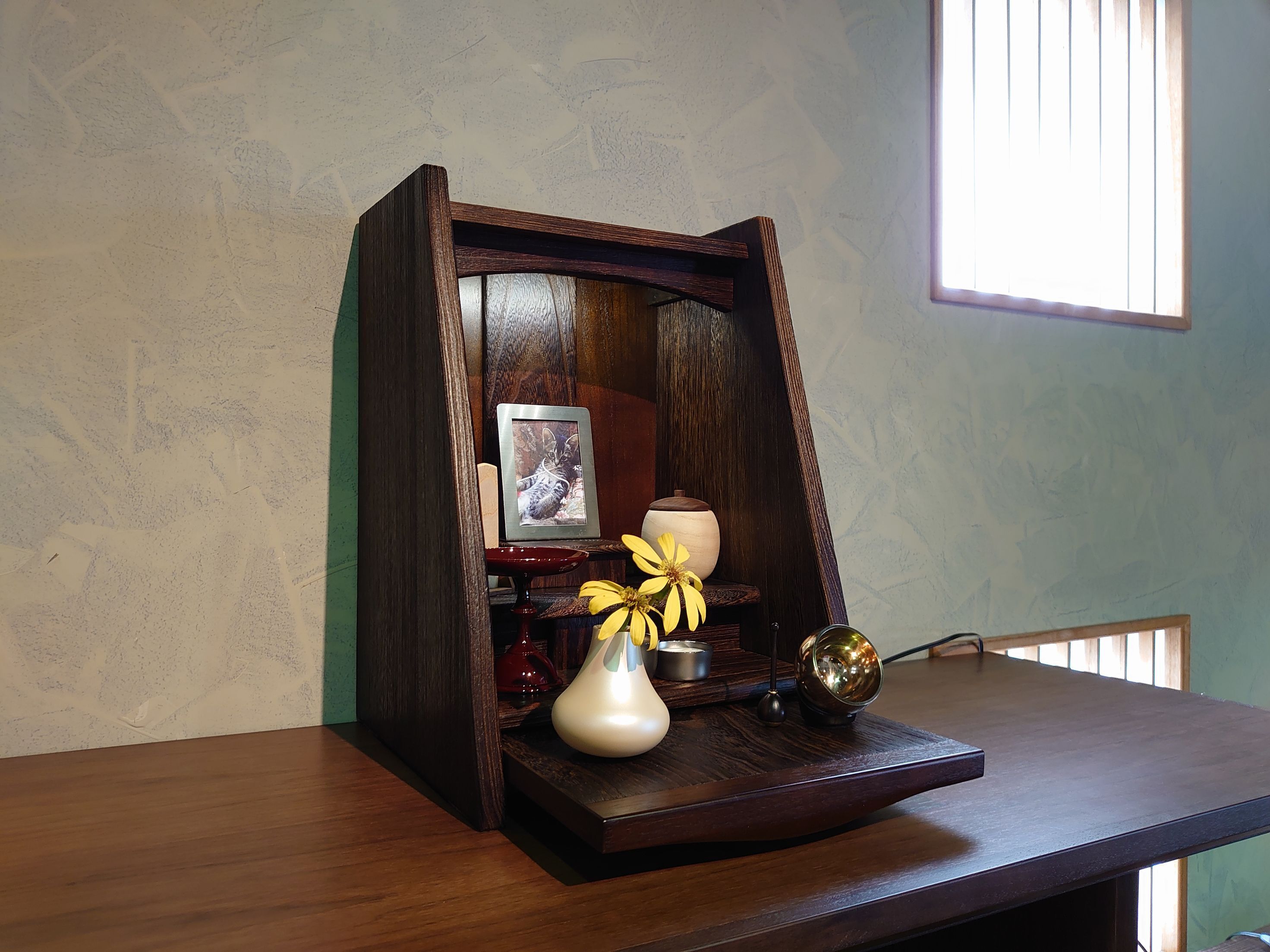 そこで一見、「仏壇には見えない」仏壇にしようという考えになりました。蓋を閉じるとちょっと変わった形の木の箱です。来客時に気を使わせる心配もありません。するとリビング以外の場所でも「目立つ場所にも置ける」というデザインになりました。