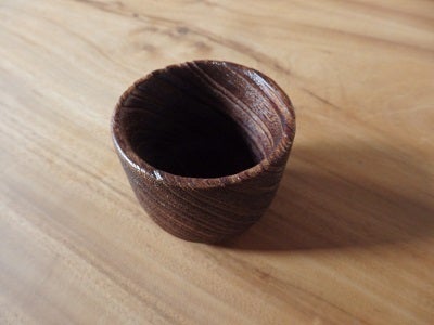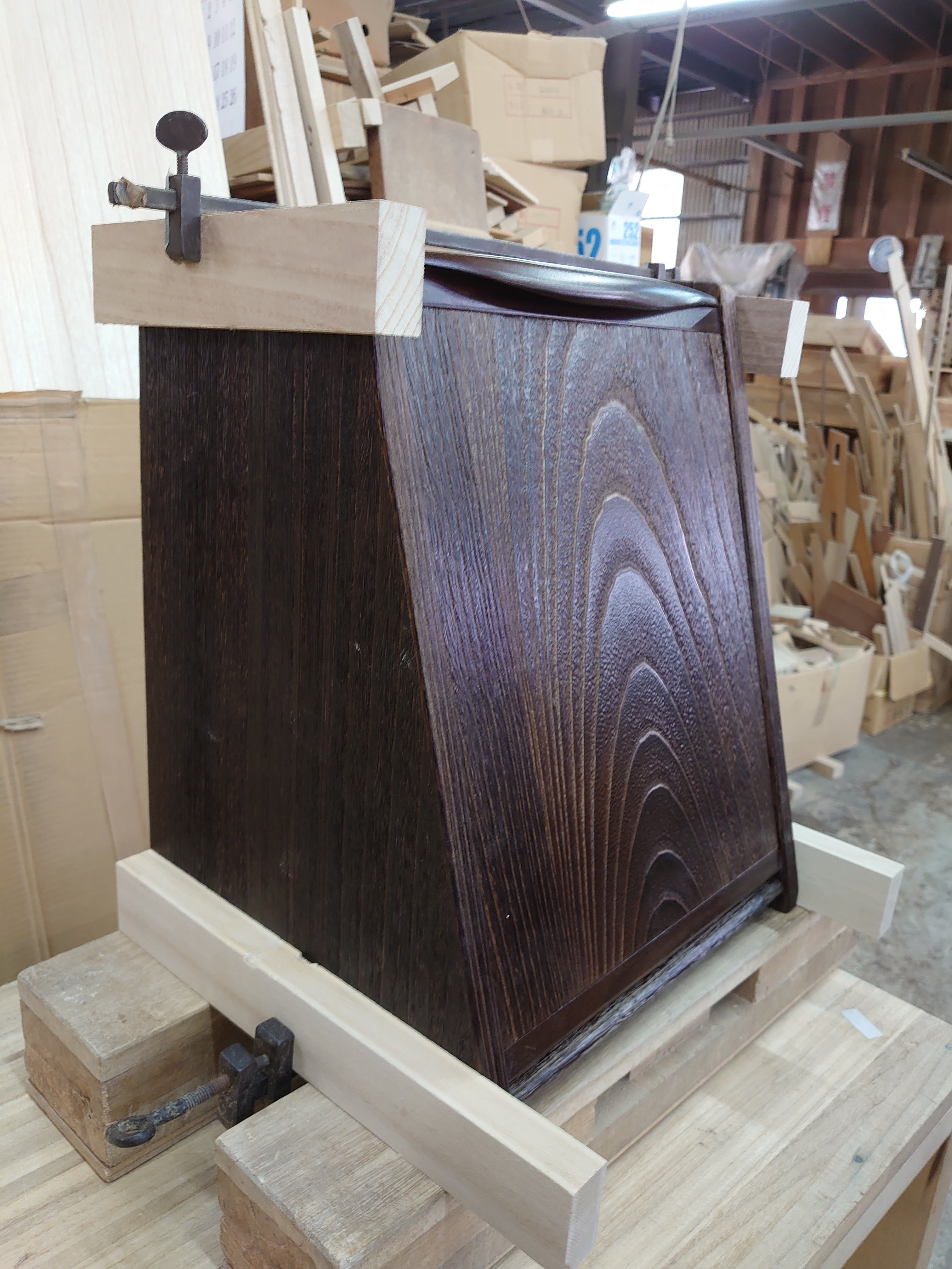 表面を焼いて、宇造り仕上げにしています。そうすることで色合いに濃淡ができ、木目が立体的に現れるのでとても風情を感じられる表情になります。見た目が黒っぽくなると、実際は軽いのに重厚感と高級感が出てきます。また桐の花言葉に「高尚」という言葉があり、まさに品のある穏やかさを感じさせてくれる存在となっています。表面には防水処理を施していますので水をこぼしても問題ありません。余計な装飾は付けず、できるだけシンプルにしていますので水拭きで簡単にお手入れができます。