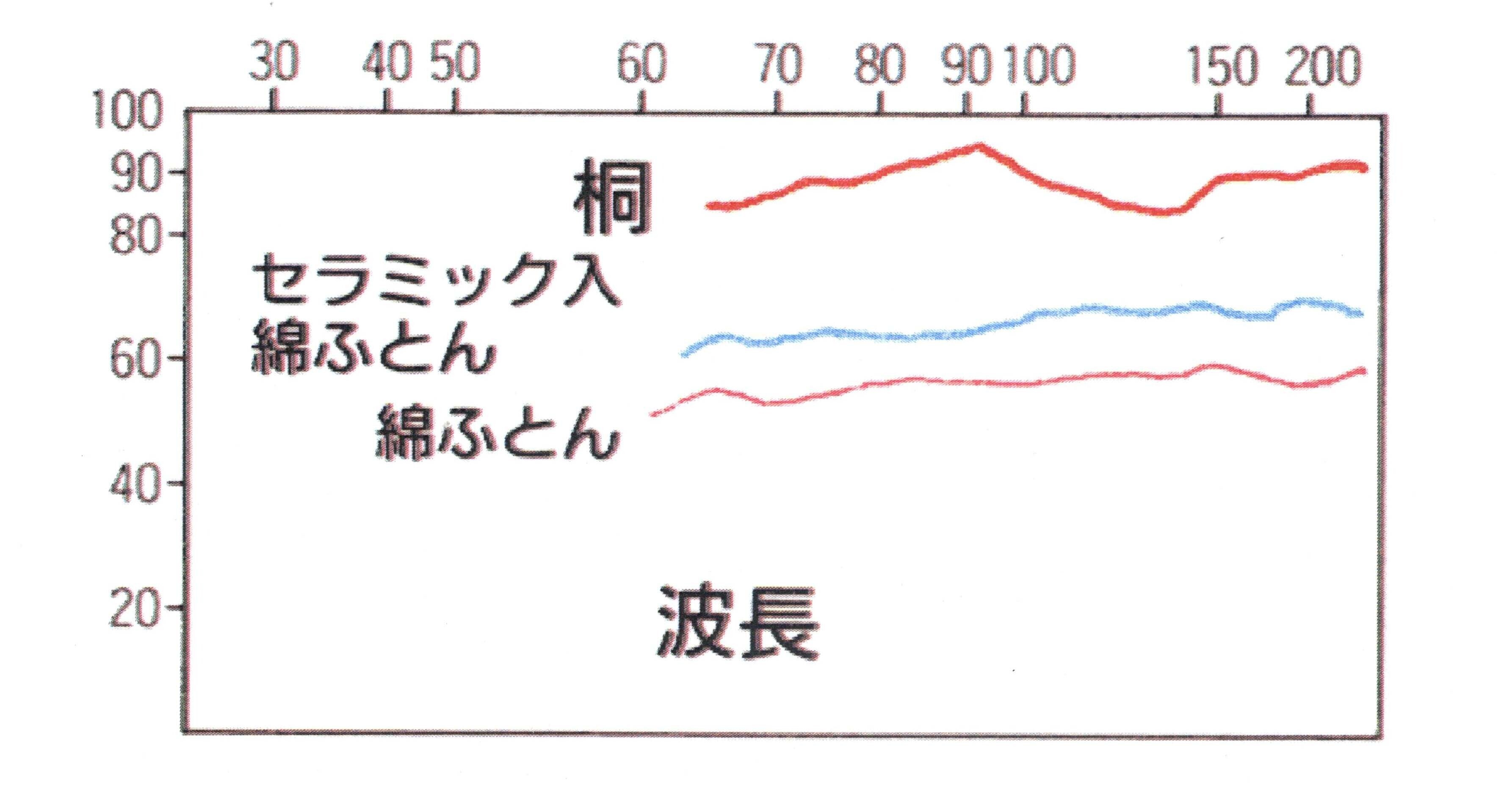 桐も遠赤外線を放射しています。温度あるものは人間でも石でも遠赤外線を放射していますが、桐の遠赤外線の放射率は炭素と同等で、人体の発する遠赤外線の波長9.4μと同じだと言われており血行の流れを促進し老廃物の排出を手助けしてくれます。