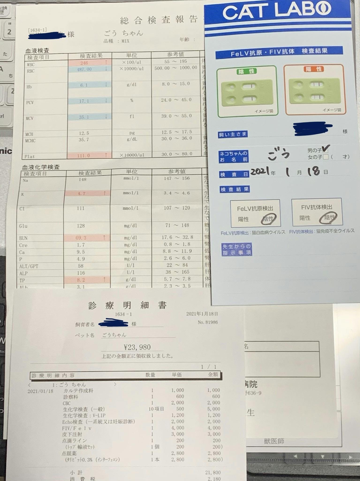 脱水と炎症値が高く、クレアチニンはまだ酷くないもののBUNの数値が高かったです。病院の方針としてはインターフェロンの点眼と点鼻。目鼻の調子が悪いのもあり食欲なく、動かなくなってるのではないかとの判断でした。