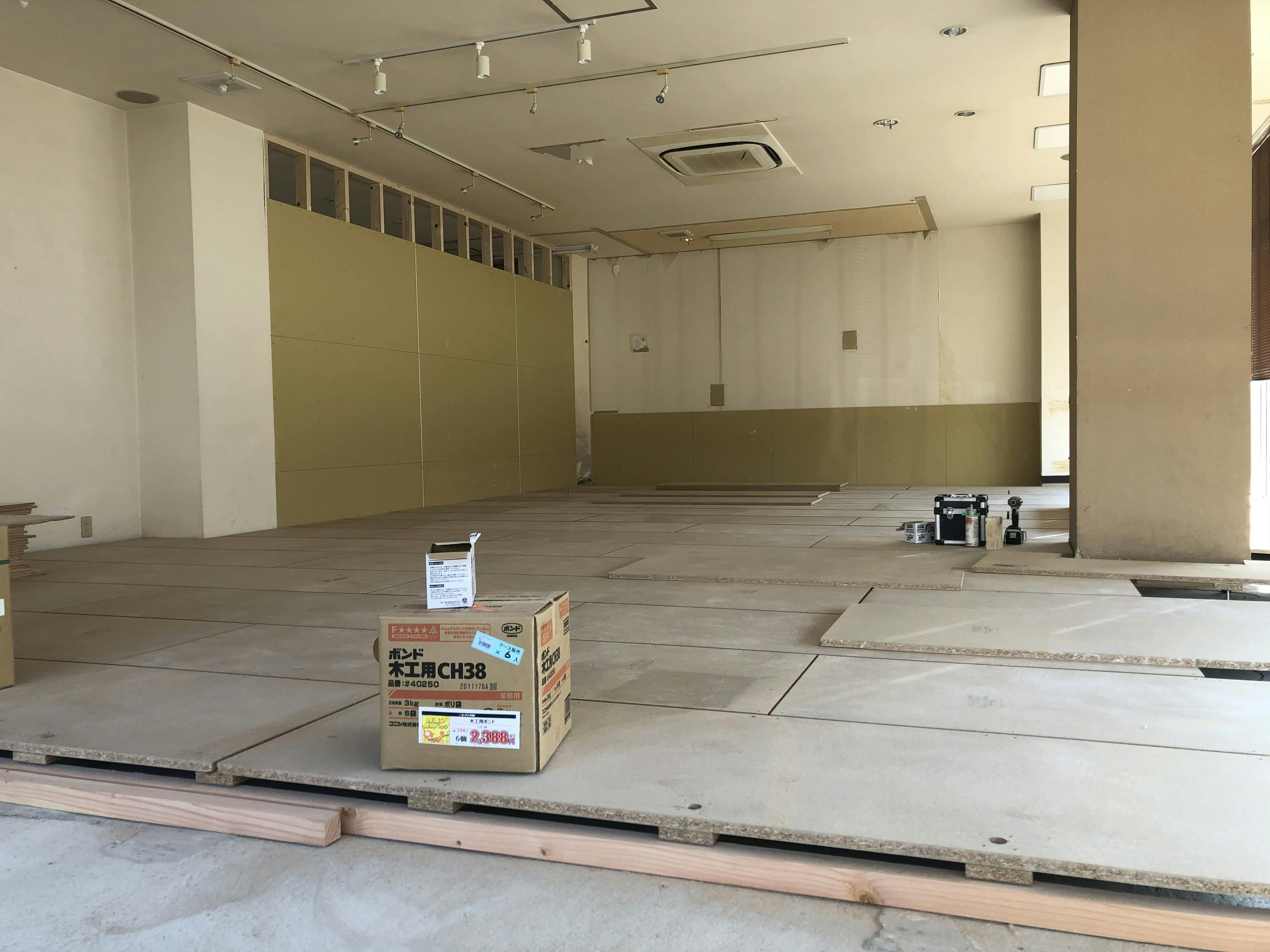 年明け早々、壁紙を貼りに行ってきました。写真一番奥の面です。人生初の壁紙貼りなんですが、わたし一人では背の高さが追いつかなさそうでしたので、夫の手も借りました。スタジオ側はなんとか終わりました。