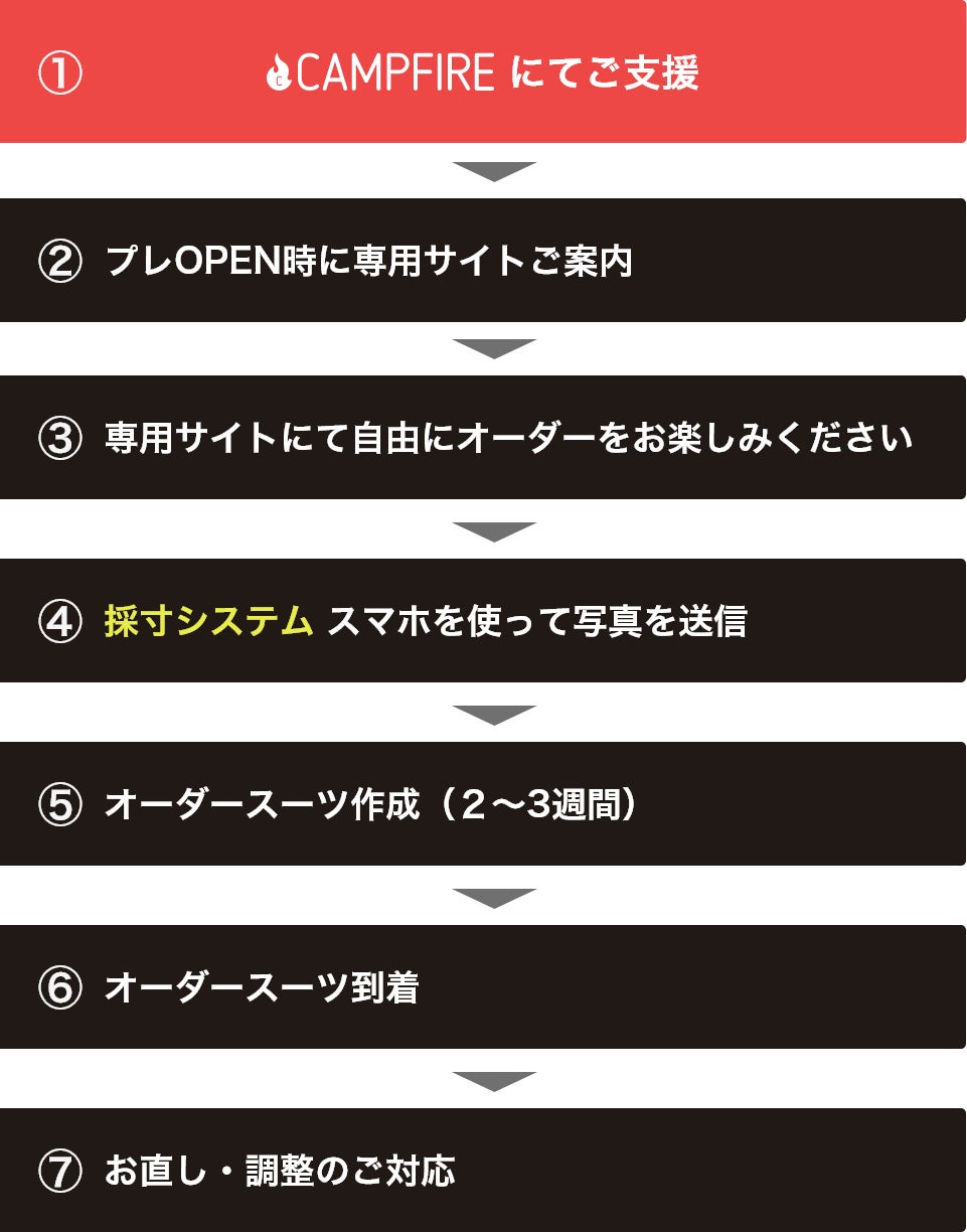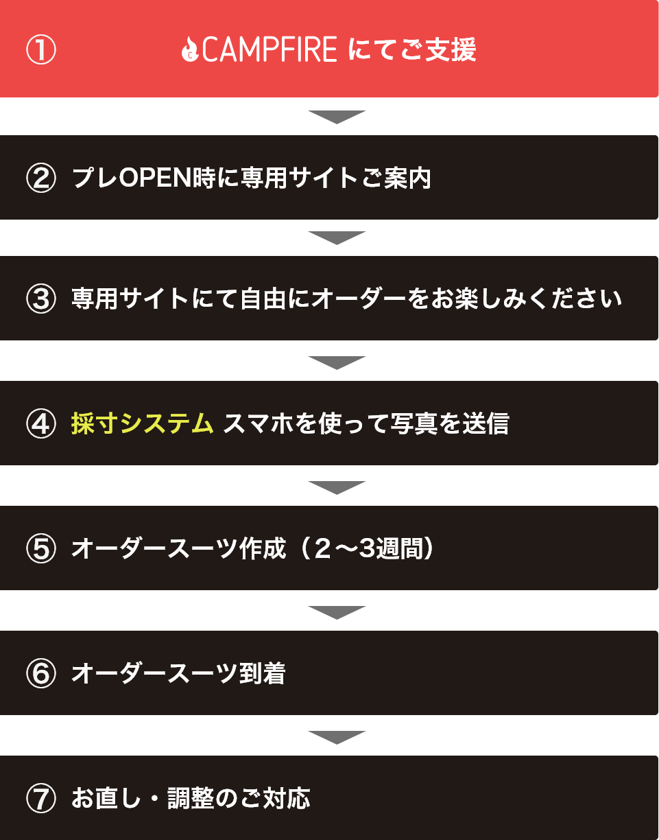 本プロジェクトにご支援いただいた、限定30名様へオープン前に専用サイトへご案内させて頂きます。専用サイトではご自由にオーダーカスタマイズをお楽しみ頂いた後、専用採寸システムを使って写真を送って頂きます。あとはパターンオーダースーツが届くのをお待ちいただくだけ!また縫製のプロフェッショナルとして、到着後のお直し・調整も対応させて頂きます。