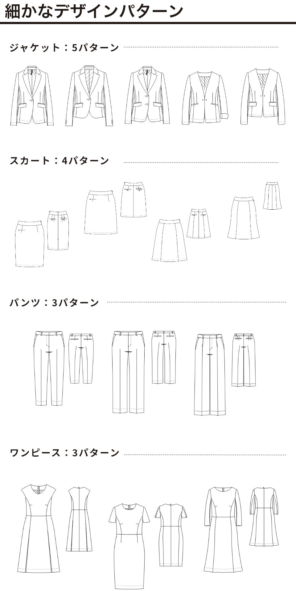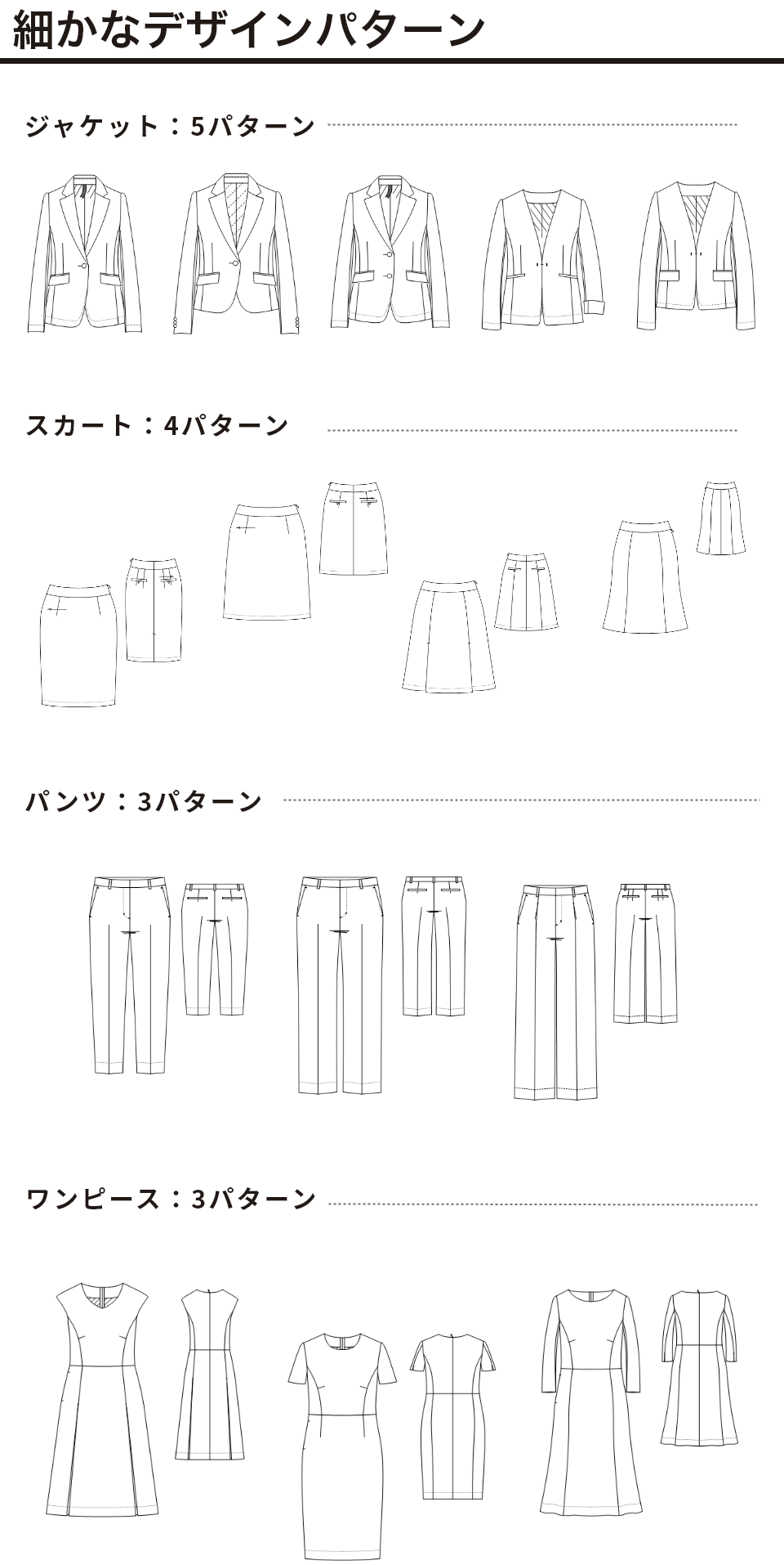 トレンドやシーンを考慮した様々なパターンをご用意しております。女性のこだわりを1つのスーツとして実現する為に、女性プランナーを中心に企画。必要とされるデザインパターンは惜しみなく準備させて頂いております。