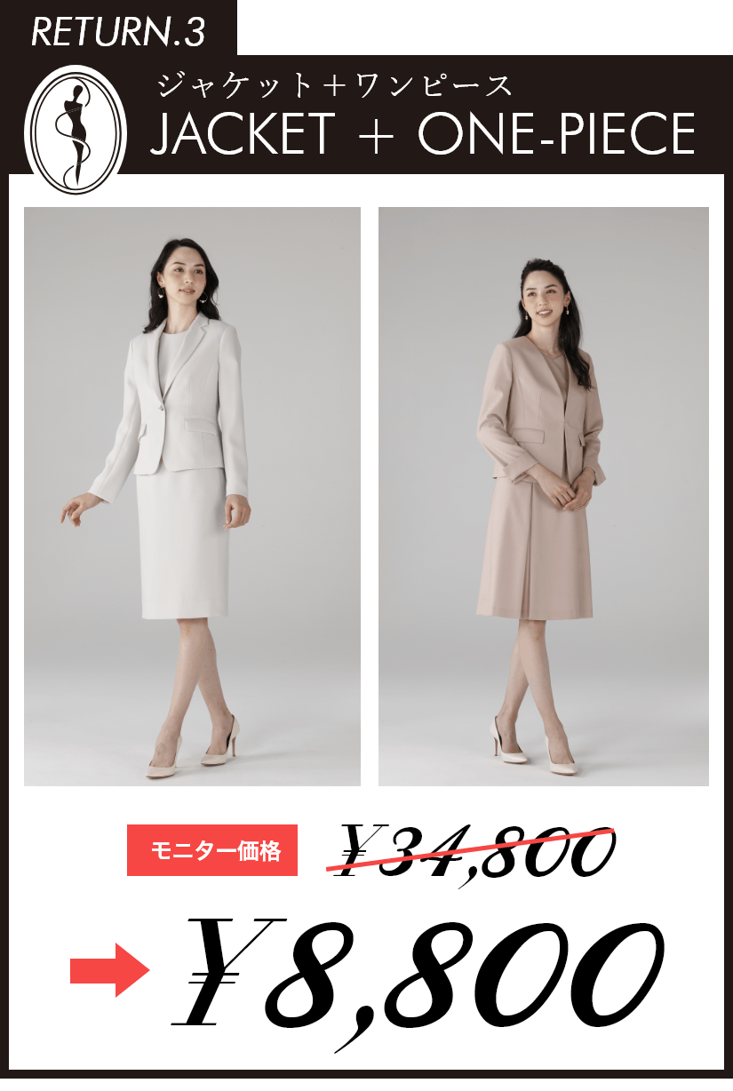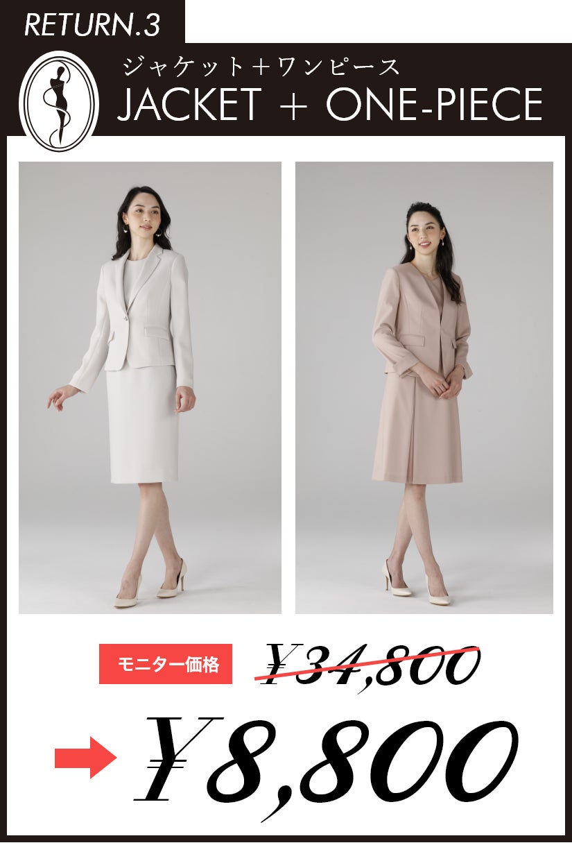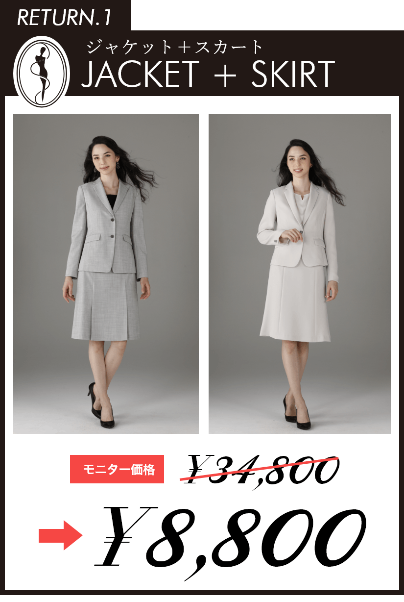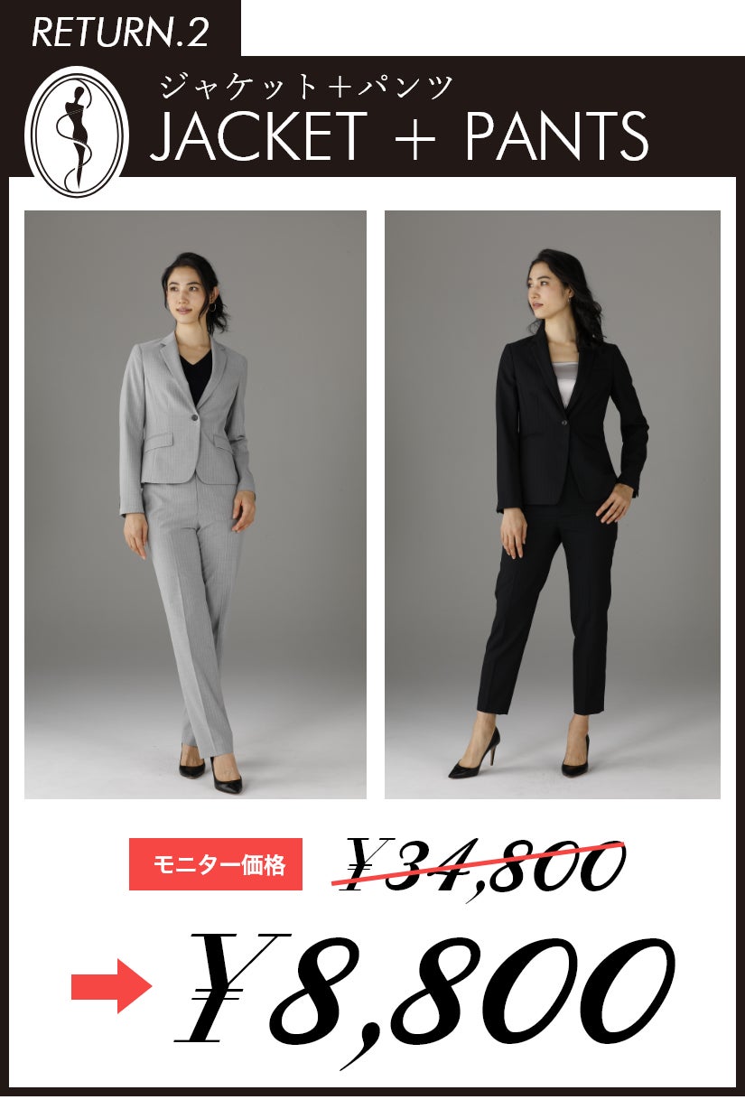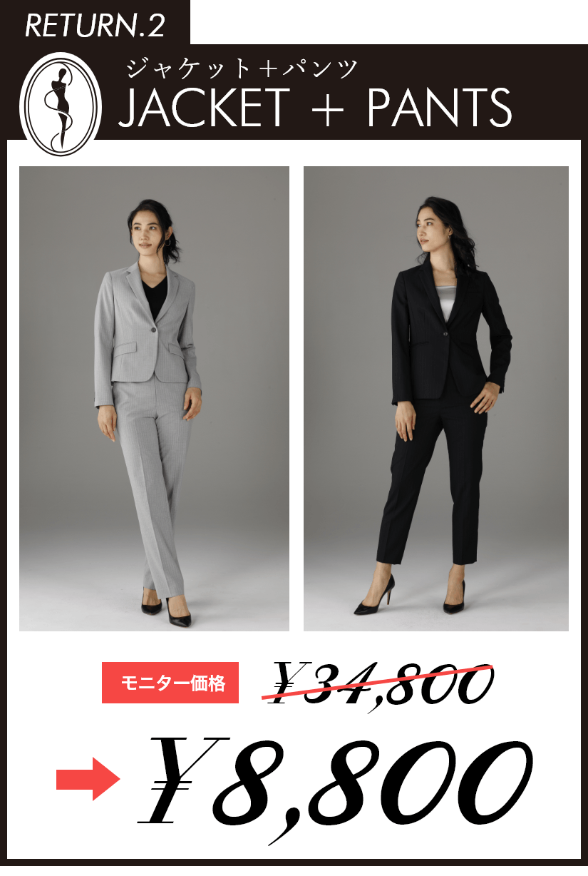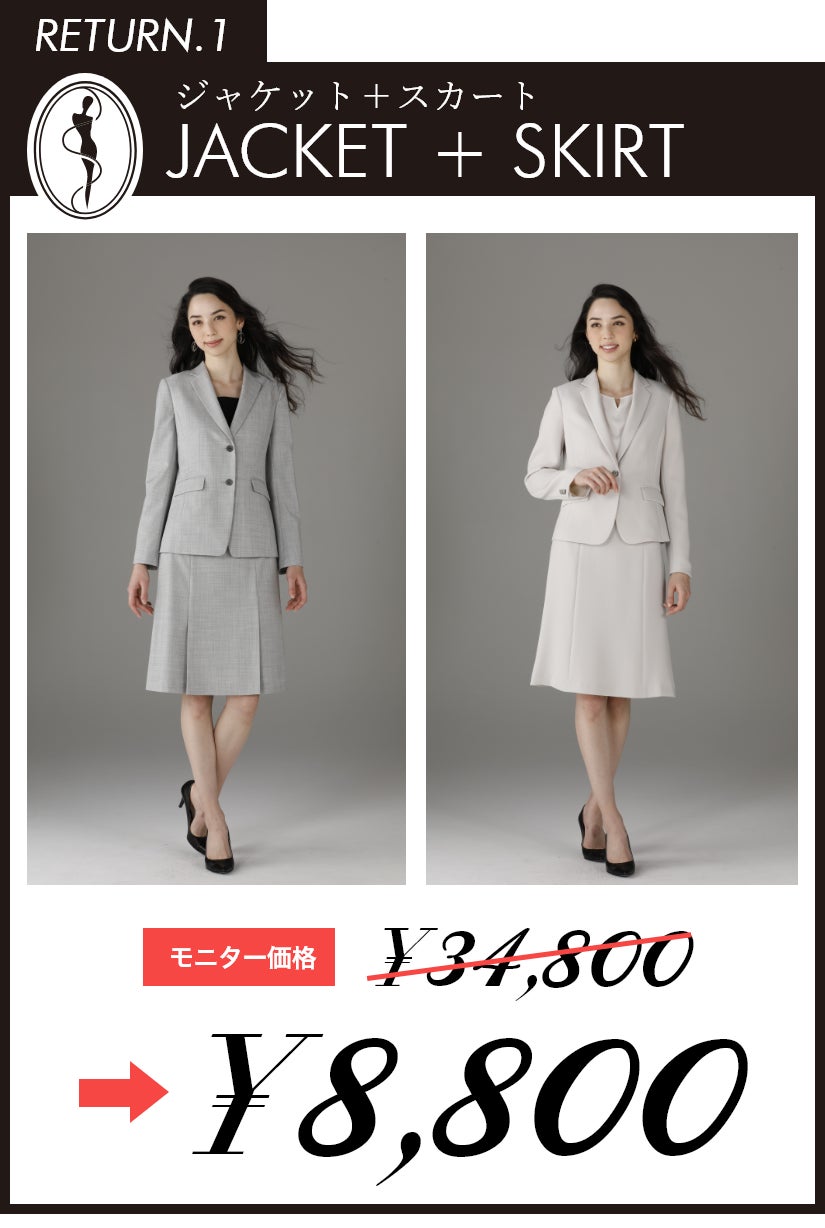 レディースオーダースーツ専門ブランド「JeEtD(ジュエディ)」 の公式サイトでは、24800円~36800円でのラインナップを準備しておりますが、今回のモニターキャンペーンにおいては、どの組み合わせでオーダー頂いても、30名様限定で一律8800円にて本格的なオーダースーツをお作り頂ける今回限りのテストマーケティングとなります。46年の高い縫製技術とノウハウ、こだわりの素材で作られるレディースオーダースーツのクオリティには絶対な自信を持っております。ぜひ一度この機会に本格オーダースーツを一着お作りください。