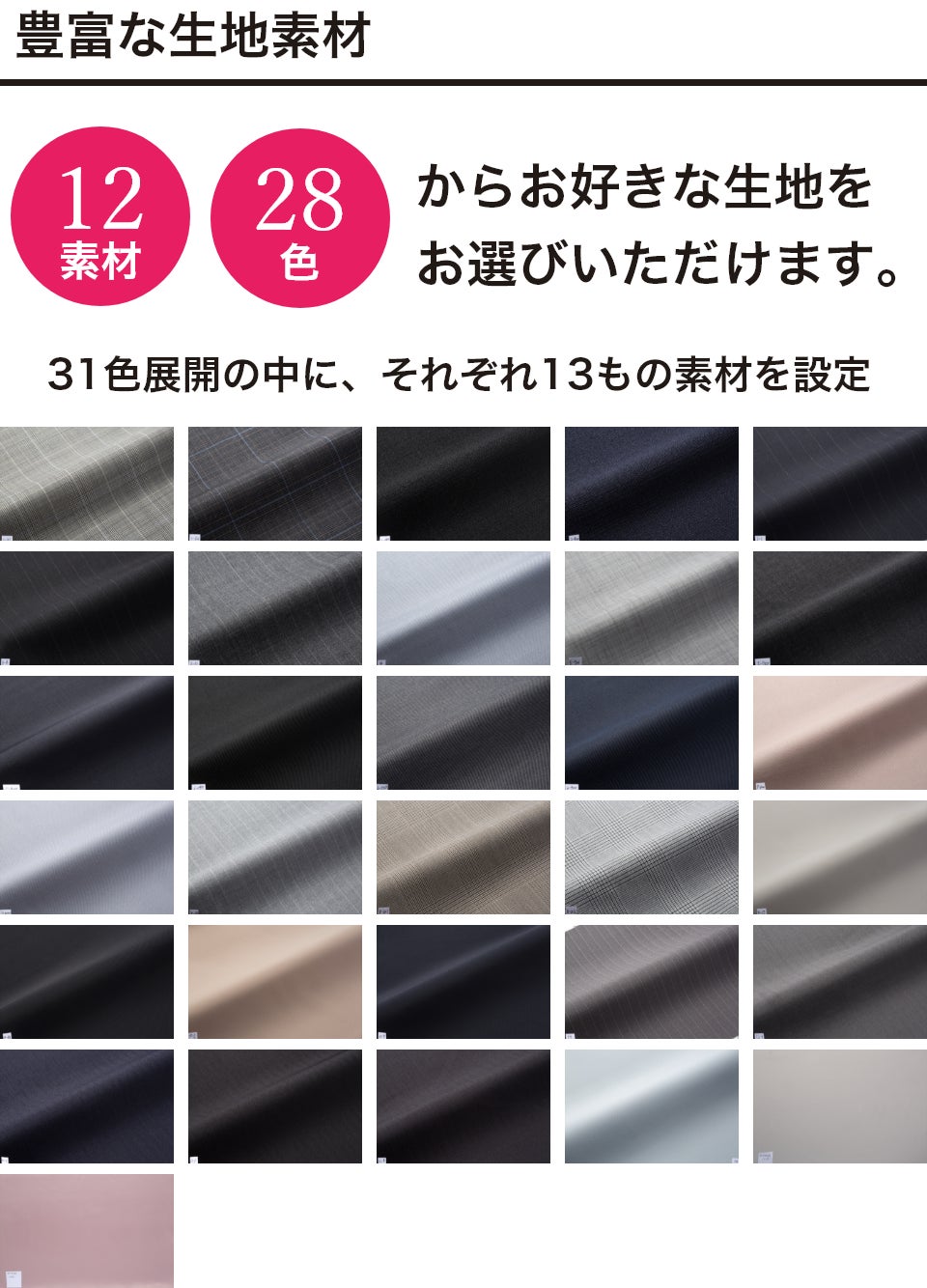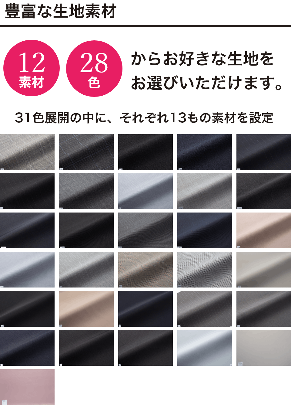 31色の豊富な生地をご用意しております。フォーマルシーン、ビジネスシーン、カジュアルなど、様々な用途やシーンに合わせた生地選びが可能です。