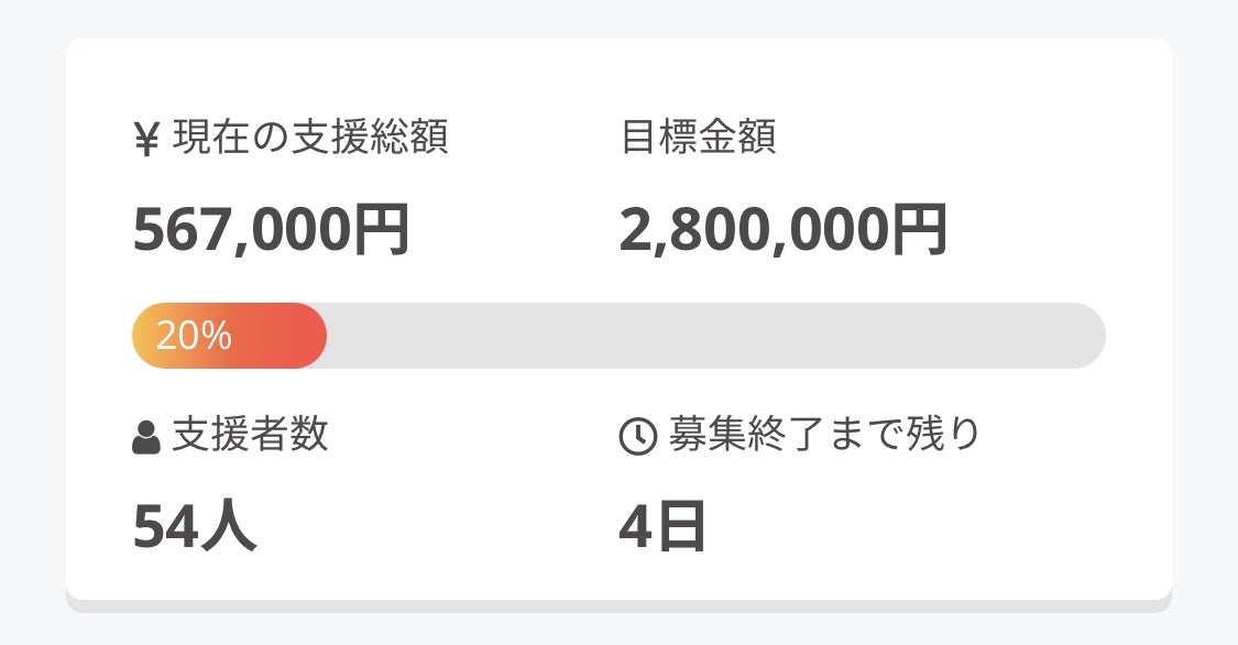 2021/02/28 14:05クラウドファンディングご支援頂きありがとうございましたッ!!!目標額280万円達成は至りませんでしたが、ご支援頂いた816,000円を大切に使わせて頂き、方法を模索しながら夢に繋げて行きたいと思います。最後の最後まで一緒に駆け抜けてくださり、本当にありがとうございました!! もっと見る