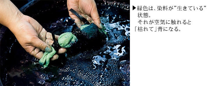 空気に触れ酸化することによってしだいに緑から青へと移り変わる藍の特性と、