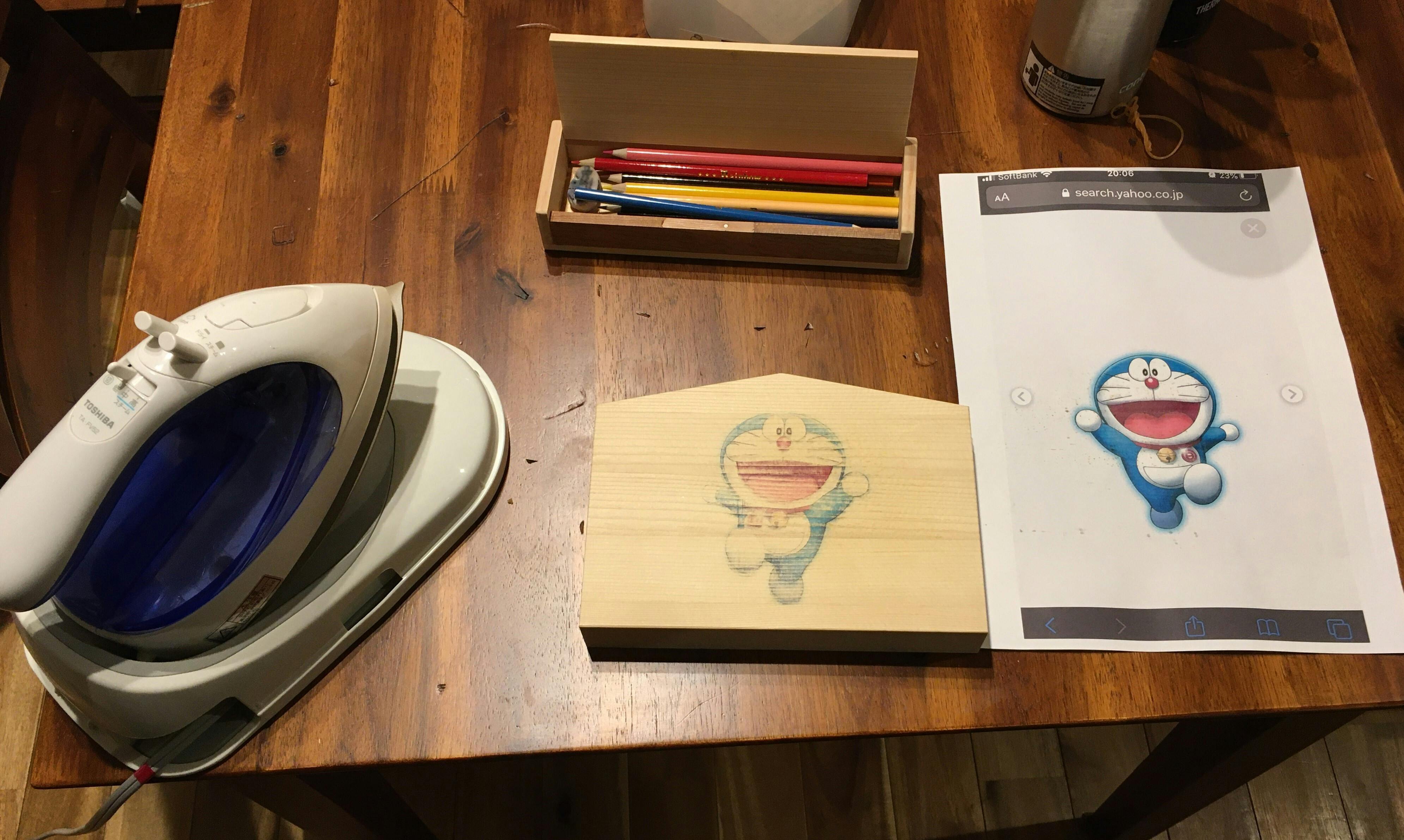箱に印刷した絵を載せて、アイロンをかけます。アイロンの温度は「高」に設定してください。ゆっくり全面を当てながら伸ばしてください。絵が小さい場合は、ガムテープ等で紙を固定した方がずれにくいと思います。また、温度が高すぎと、木が焦げてしまうので、出来具合を確認しながら、加減してください。