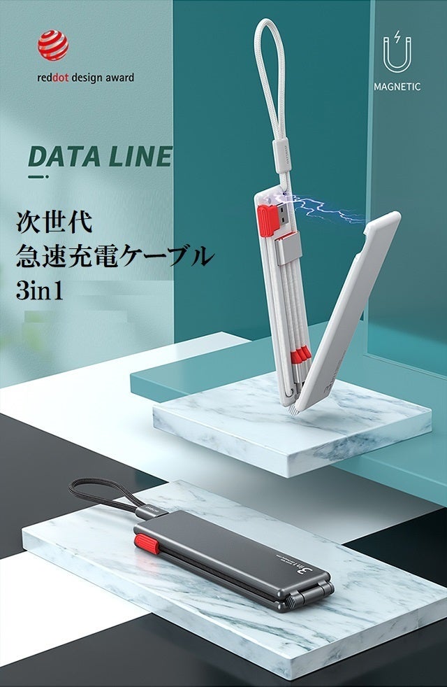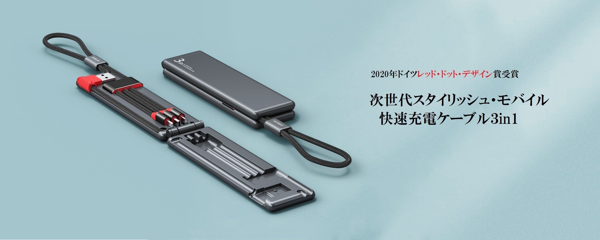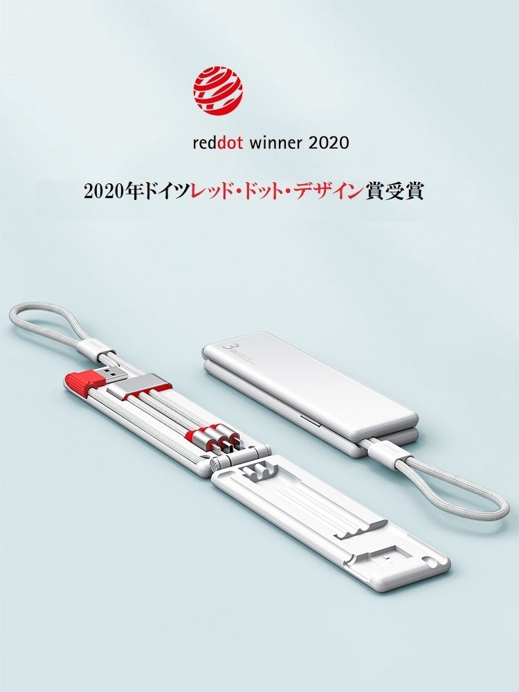 2020年ドイツでレッド・ドット・デザイン賞を受賞!3in1急速充電ケーブル「MAGIC BOX」は3本同時に充電可能で、わずか58gと驚くほどコンパクトで持ち運びも楽々です。