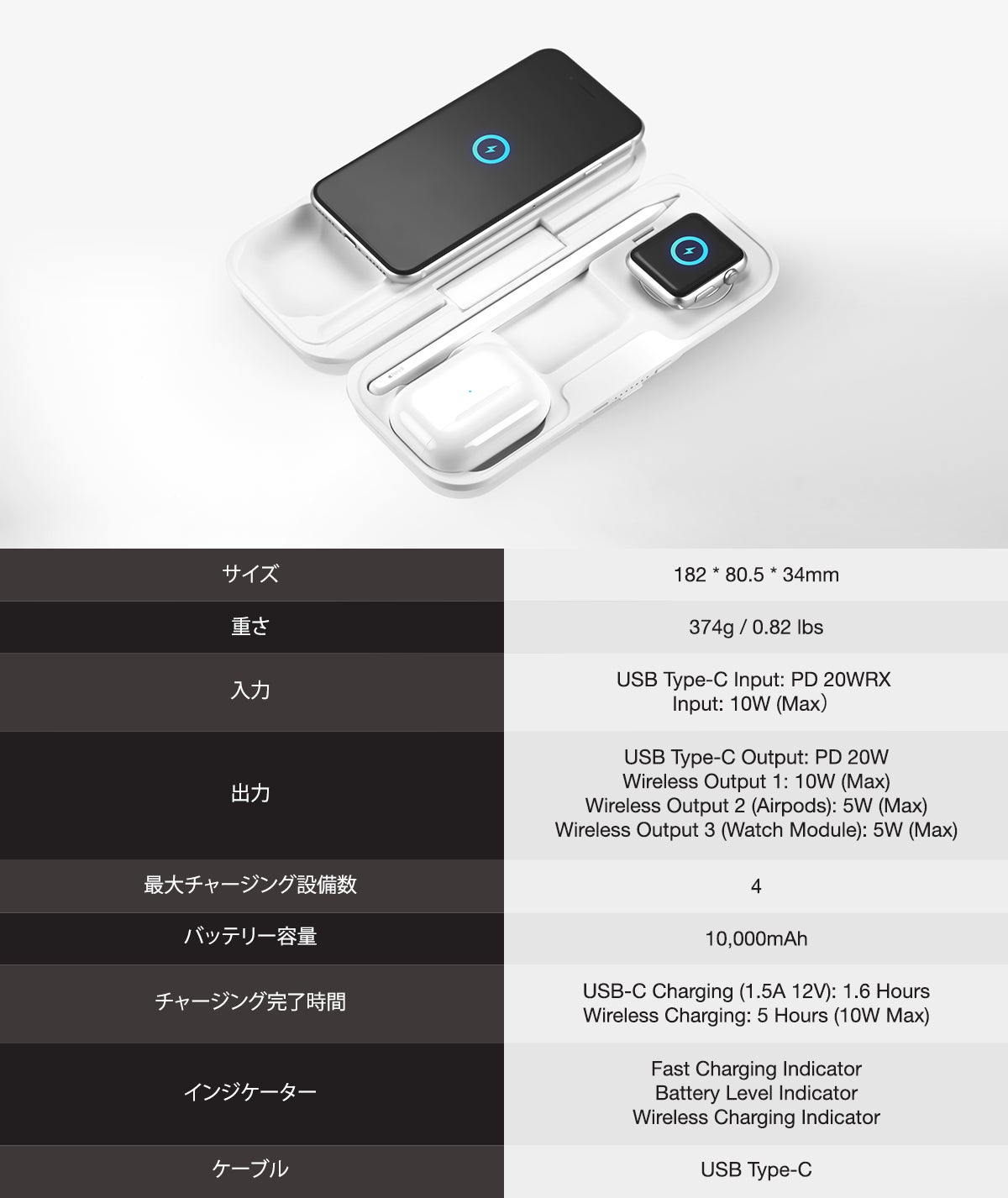 「MOMAX airbox」 は10000mAh大容量のバッテリーが付いています。途中で電量が切れるには心配いりません。AirPodsに25回、iPhoneに3回、iPad Miniに1.5回、Apple Watchに16回完了まで充電できます。