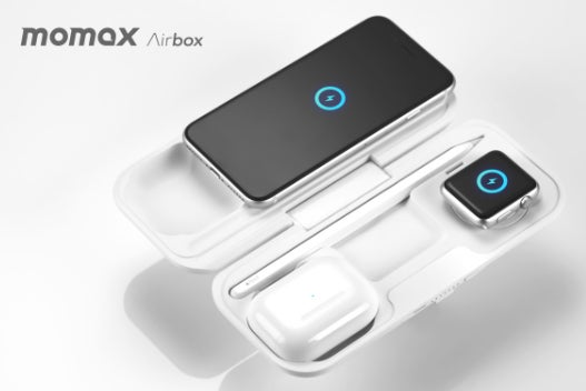 「MOMAX airbox」 はモバイルバッテリーですが、自宅でオフェンスでコンセント(ACアダブター)に接続すれば、すべてのデバイスを同時に充電できる無線充電ステーションとして使えます。