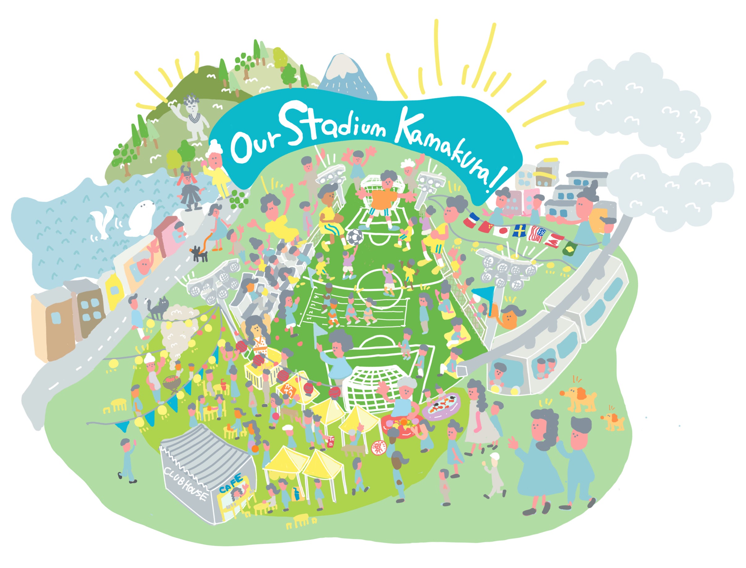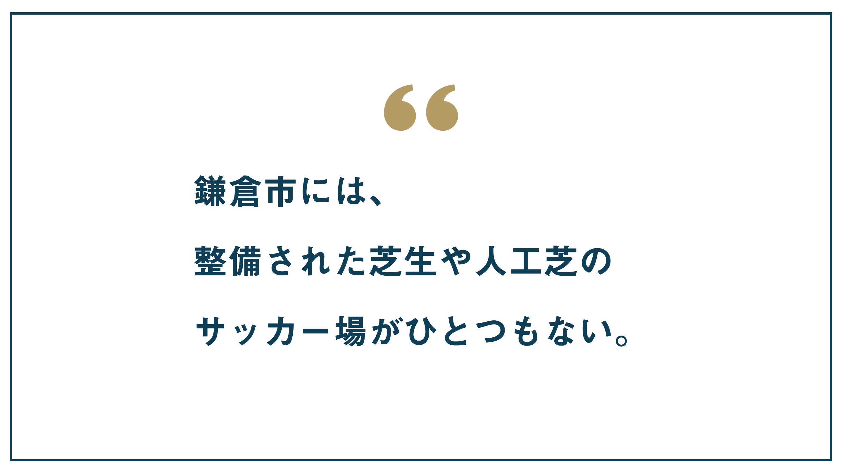 歴史深き日本文化と国際文化が融合し、美しい自然に囲まれる鎌倉の街には、みんなが楽しめる、綺麗に整備された芝生のグラウンドが、ひとつもありません。そしてまた日本には、スポーツを通じて国際交流を存分に実現できるような理想的な場が、ひとつもありません。私たちは、この2つを同時に実現できる場をゼロから創ることで、鎌倉の街を、日本を、もっと豊かにしたいという願いがあります。