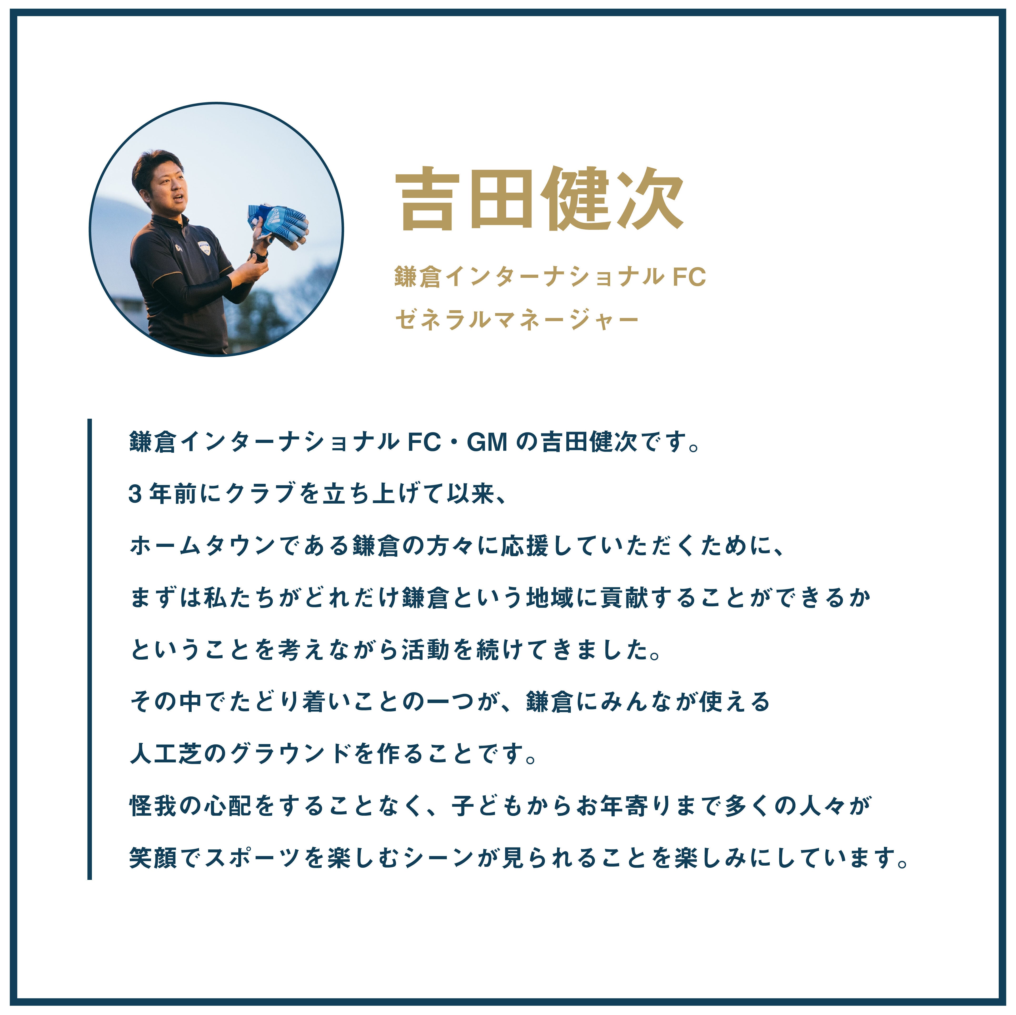 また、私たち鎌倉インターナショナルFCがプロサッカークラブになり、そして世界を目指すにあたって、充実したトレーニング環境を確保することは必要不可欠になります。良い活動環境のもと歩みを進め、プロのサッカークラブになることで、クラブとしてより大きな力をもって鎌倉や社会に影響を与え、チャレンジを続けていくこと自体が、鎌倉、ひいては日本のスポーツへの貢献になると信じています。
