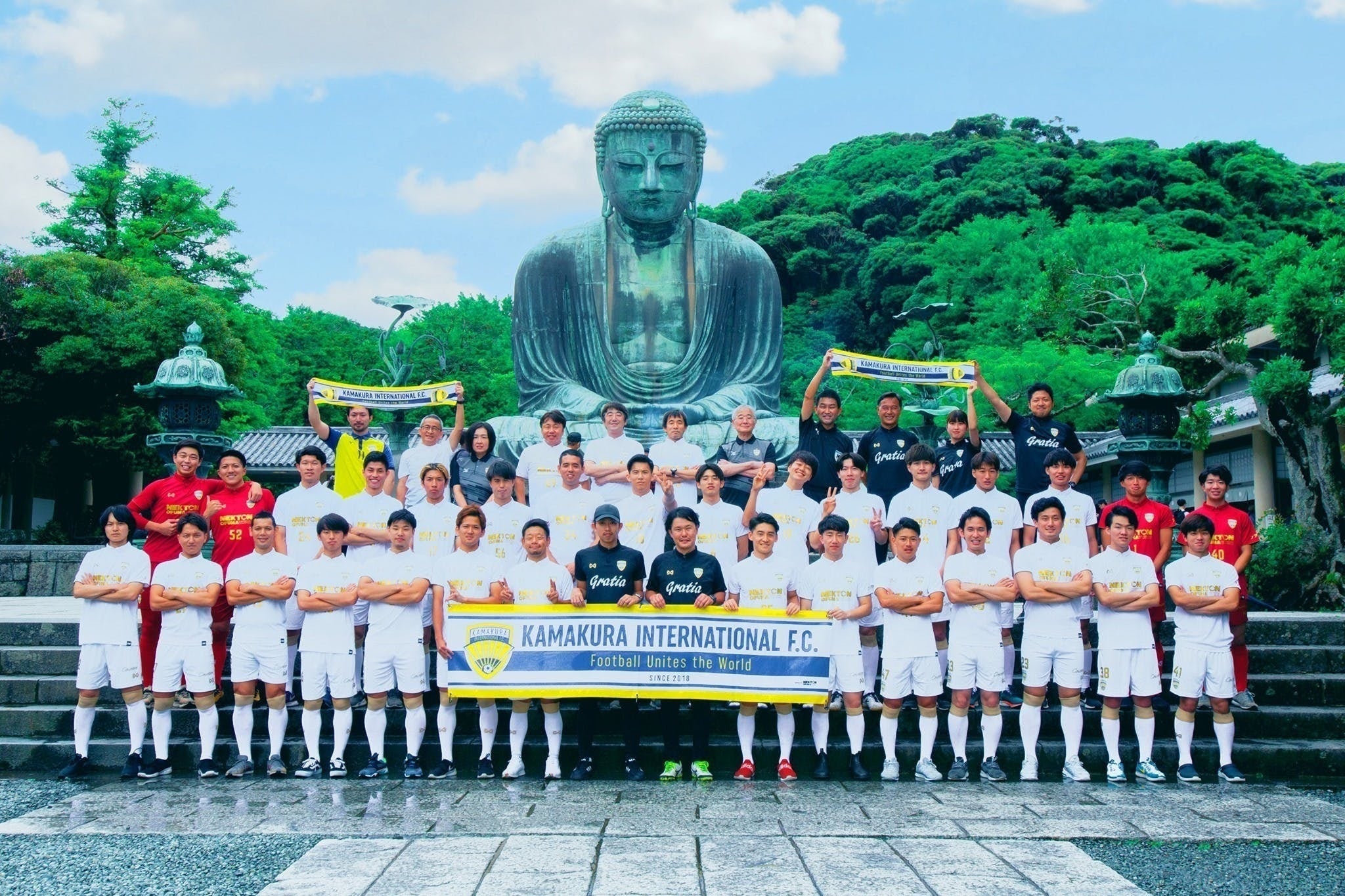 日本への帰国後、このような世界と触れる体験をより多くの人たちに届けたいという想いから、学生から社会人、企業のビジネスパーソンのグローバル人材育成の事業を立ち上げ、日本と世界各国の行き来をしています。そして、2018年に、その原体験に紐づくサッカーでの日本のグローバル化を掲げ、古都・鎌倉に「鎌倉インターナショナルFC」(以下、鎌倉インテル)というクラブチームをまったくのゼロから立ち上げ、現在に至ります。