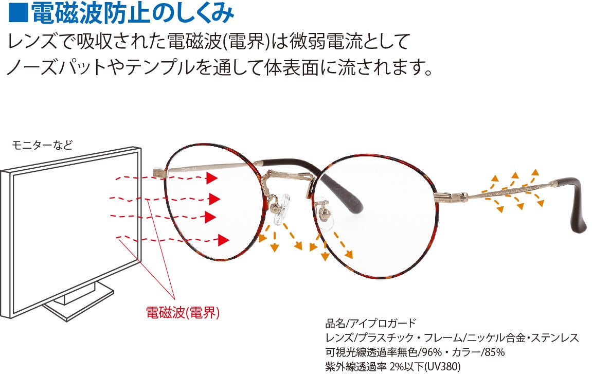 電磁波防止フレームの仕組みは、眼鏡レンズ表面に透明の酸化インジウム錫(I.T.O)導電コートを塗布し、レンズ前面で受けた電磁波を微弱な電流に変換し鼻パッド、テンプルを通じて体表にアースさせる事により電磁波から眼を守ります。体表に微弱電流を流すという事はレンズ表面の静電気も帯電しないので汚れもつきにくく、ほこりや花粉にも強いと言えます。