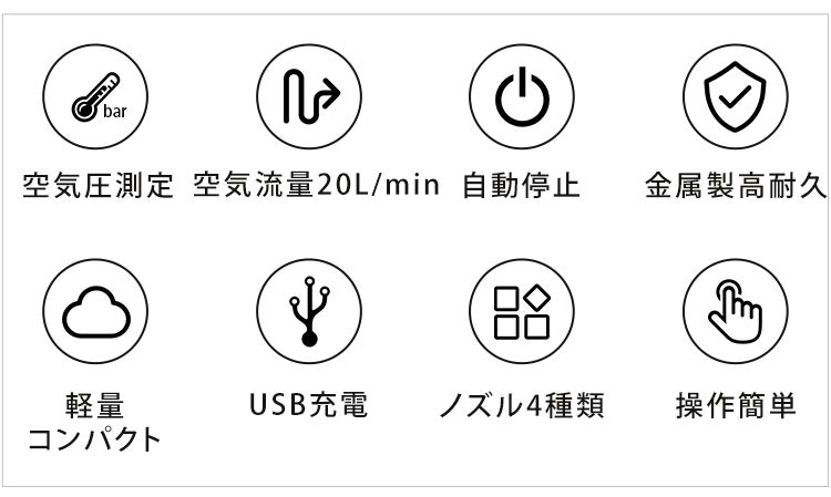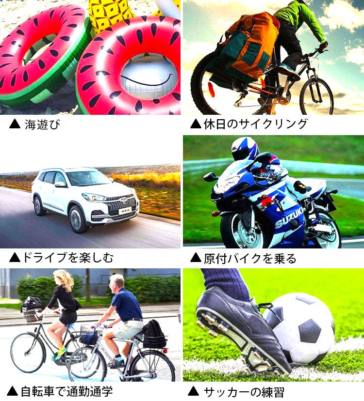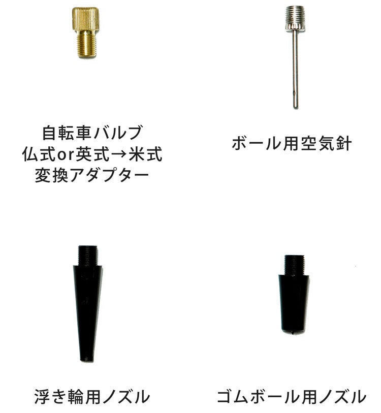 バイクや自転車はもちろん、バスケットボールやお子様用の浮き輪、ビニールプールにもお使い頂けます。各種ノズルでどんな製品でもすぐ、空気充填が完了します。