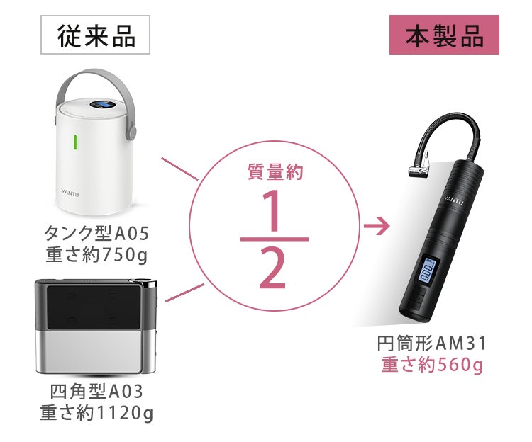 だからこそ登場したのが、本製品「ワイヤレスポータブル空気ポンプ「 AM31」! 実用性と機能性を兼備した、携帯性重視のエアポンプです。