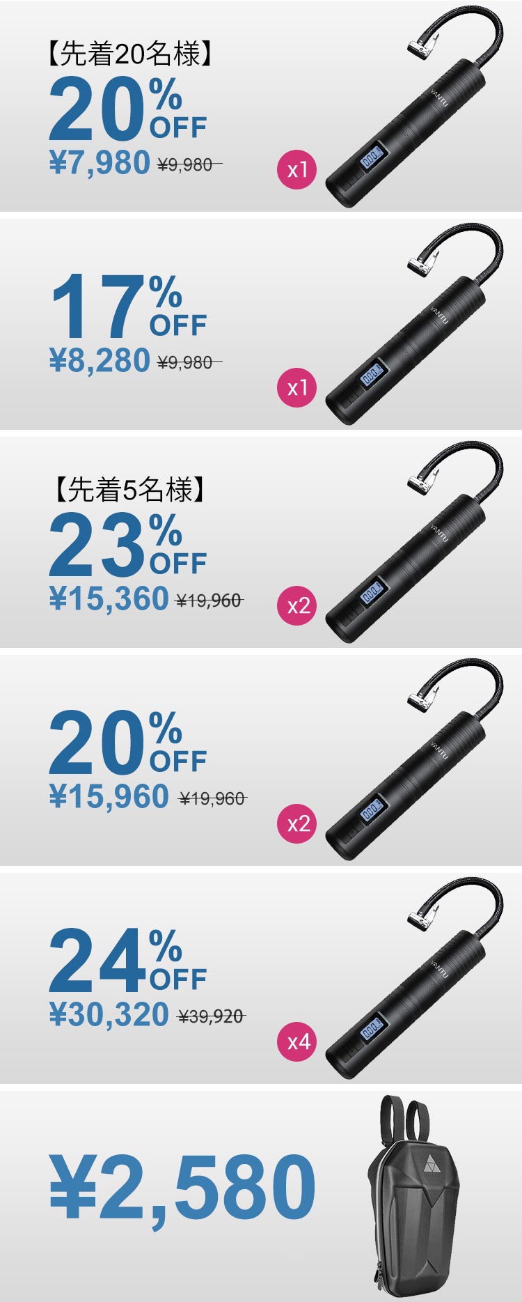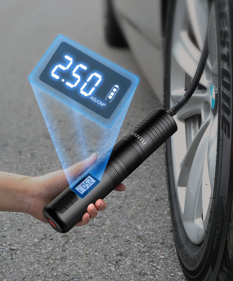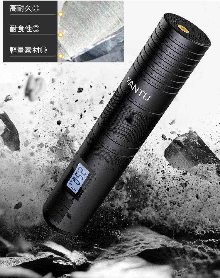 本製品は2000mAhの大容量バッテリーを2コ搭載し、内蔵されている金属モーターをパワフルに稼働。最大注入可能空気圧≦150PSIを実現し、ご家庭では難しかった自動車への空気充填も可能にしました。