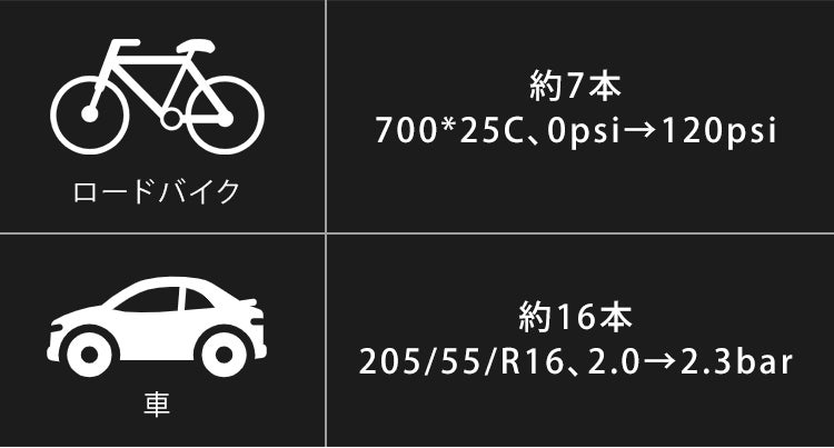 充電1回分(3~5時間のフル充電)だと、完全に空気の抜けたロードバイクのタイヤは約7本分。自宅ではなかなか難しかった車のタイヤでも、少し空気が抜けた状態から満充填する場合約16本の空気充填が可能。満充電された本製品を1本持参していると、定期的な空気補充は心配無用です。