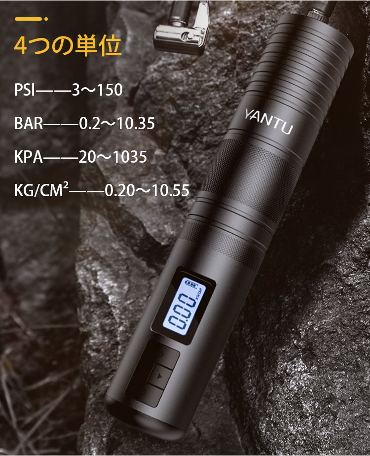 さらに4つの単位切り替え(KPa、BAR、PSI、KG/CM²)機能も搭載で、ユーザー指定の単位で空気充填が可能です。