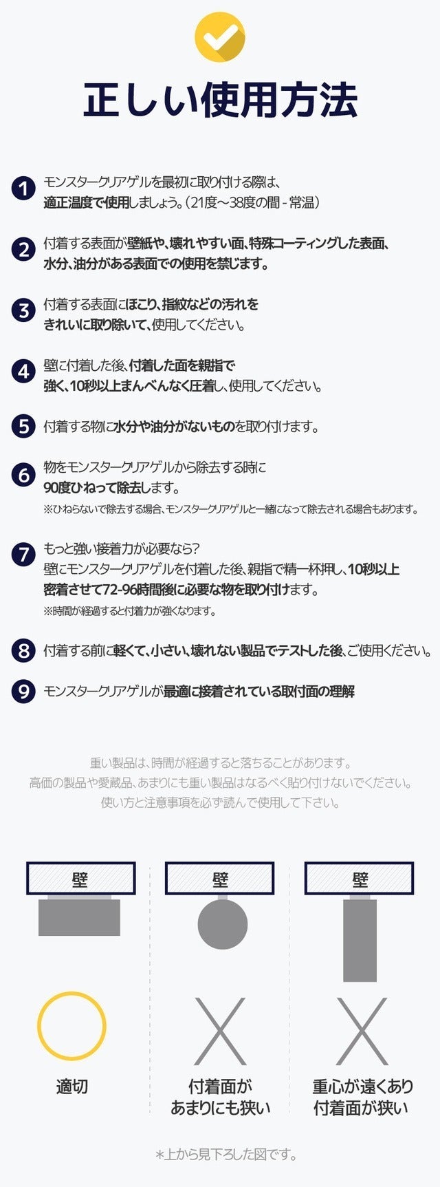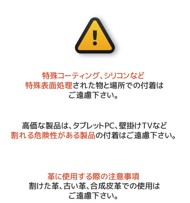 ※ 重い製品を持続的に貼り付けると落ちる場合がありますので、ご注意ください。