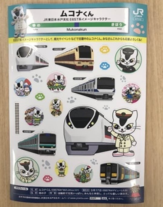 (JR東日本水戸支社提供)E657系イメージキャラクター「ムコナくん」と車両がいっぱいのシールです。