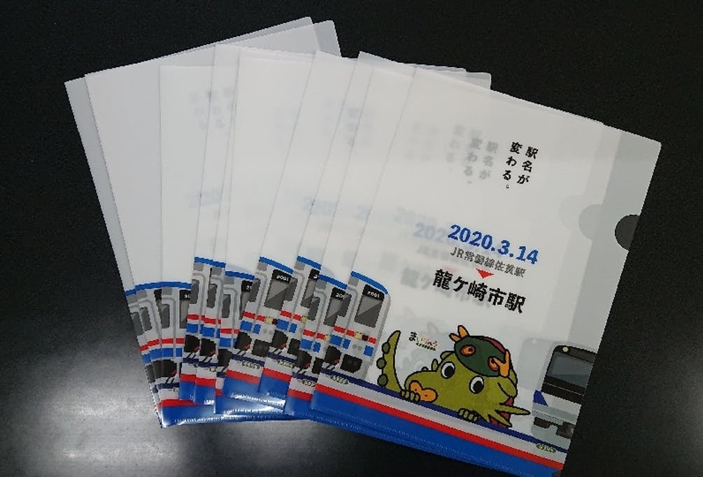 (JR東日本水戸支社・関東鉄道・龍ケ崎市提供)JR龍ケ崎市駅誕生を記念して2020年3月14日に駅などで配布されたオリジナルのクリアファイルです。