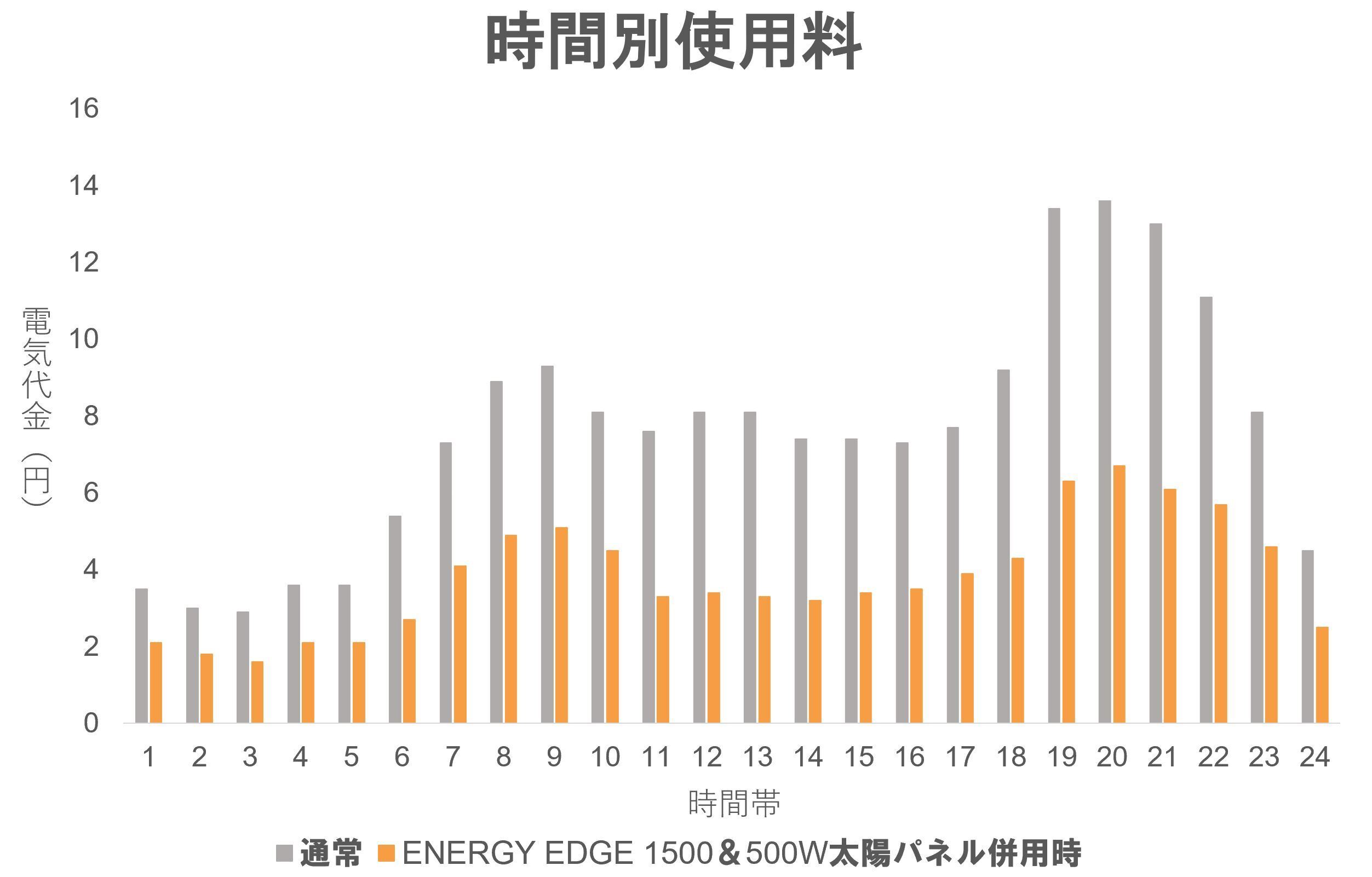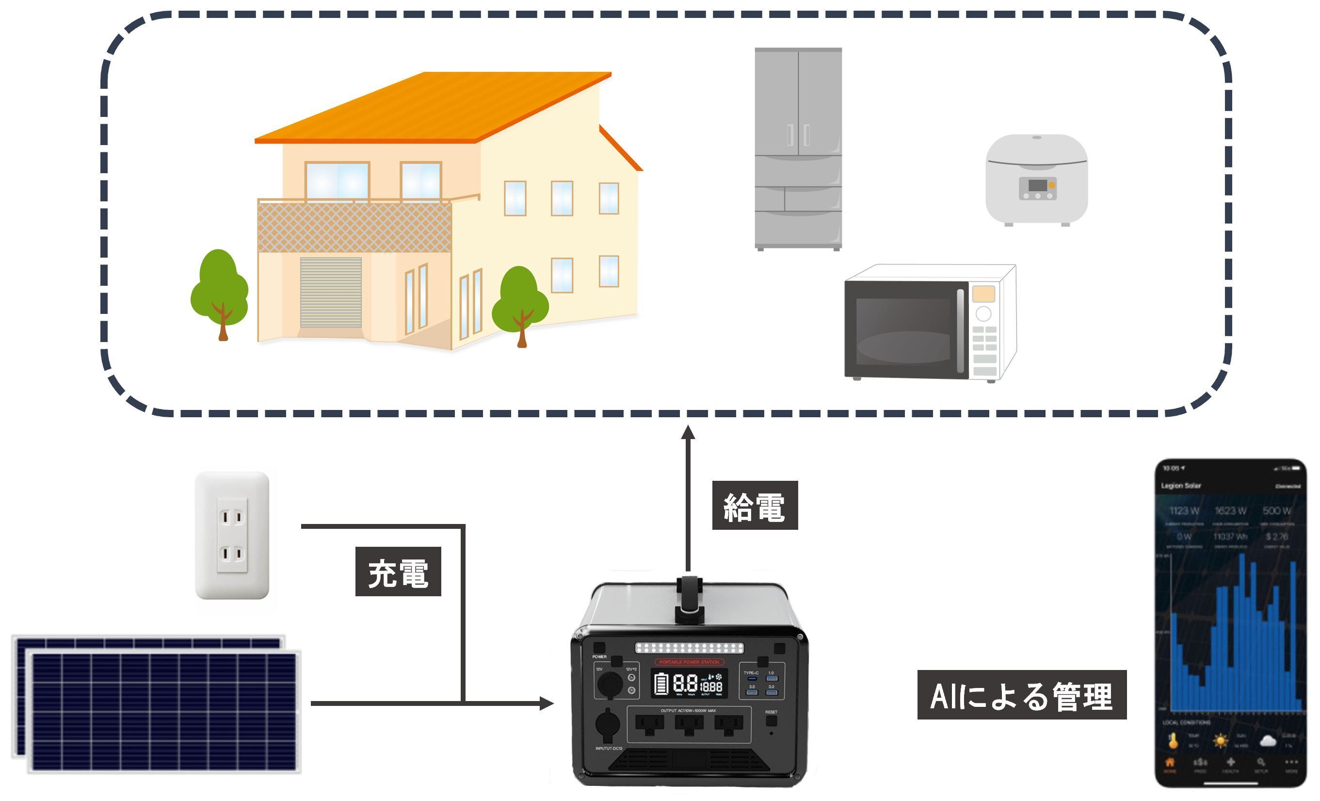 独自開発ののAI機能搭載により、家電とつなげば日中はソーラーパネルで充電し、夜間は低価格な夜間電力で充電を行います。家電が使用する電力をAIが自動で計算し、接続した家電の電気代を半分程度節約が可能です。