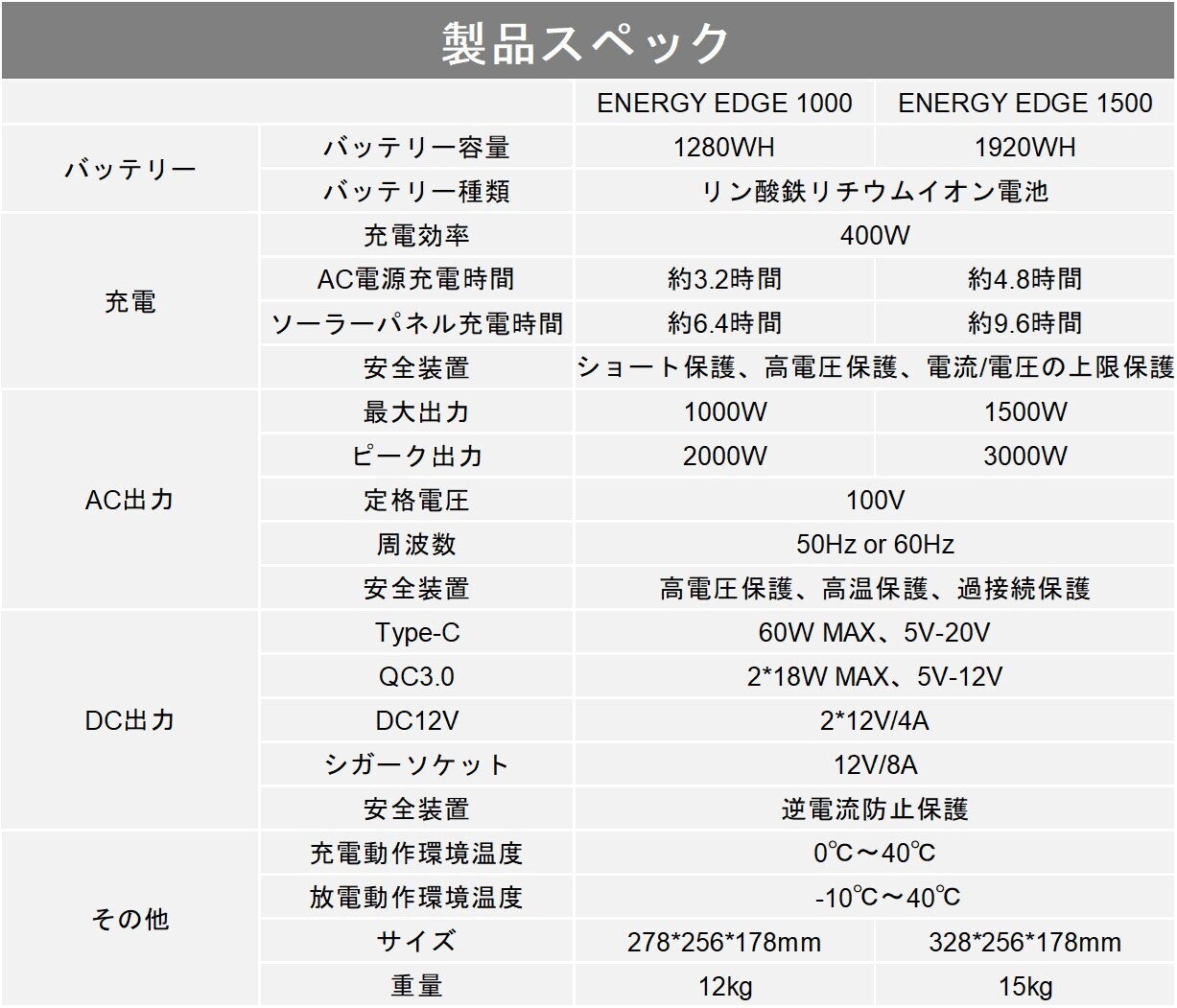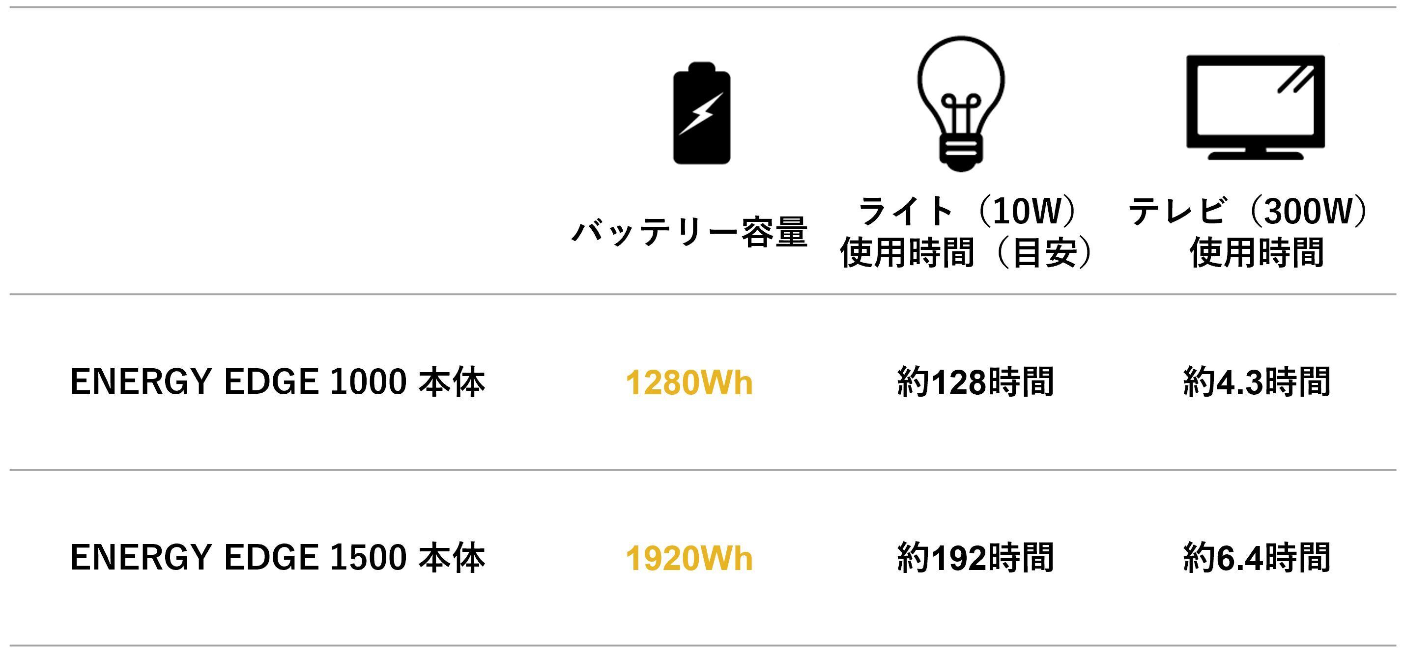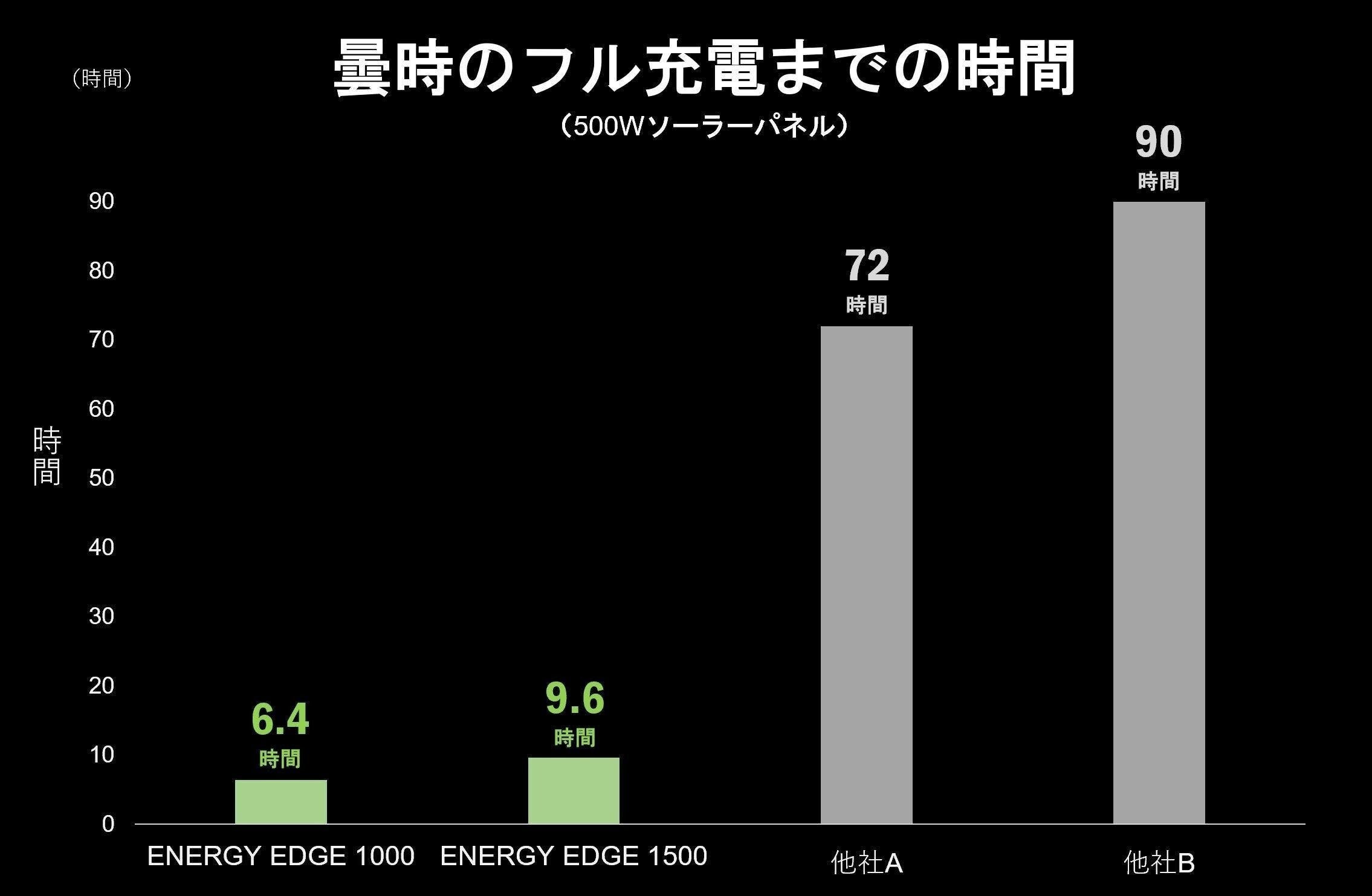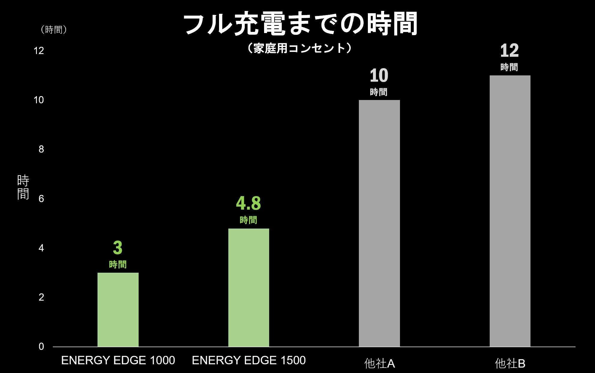 ENERGY EDGE 1000では3.2時間、ENERGY EDGE 1500では4.8時間と他社より圧倒的に少ない充電時間でフル充電が可能となっています。
