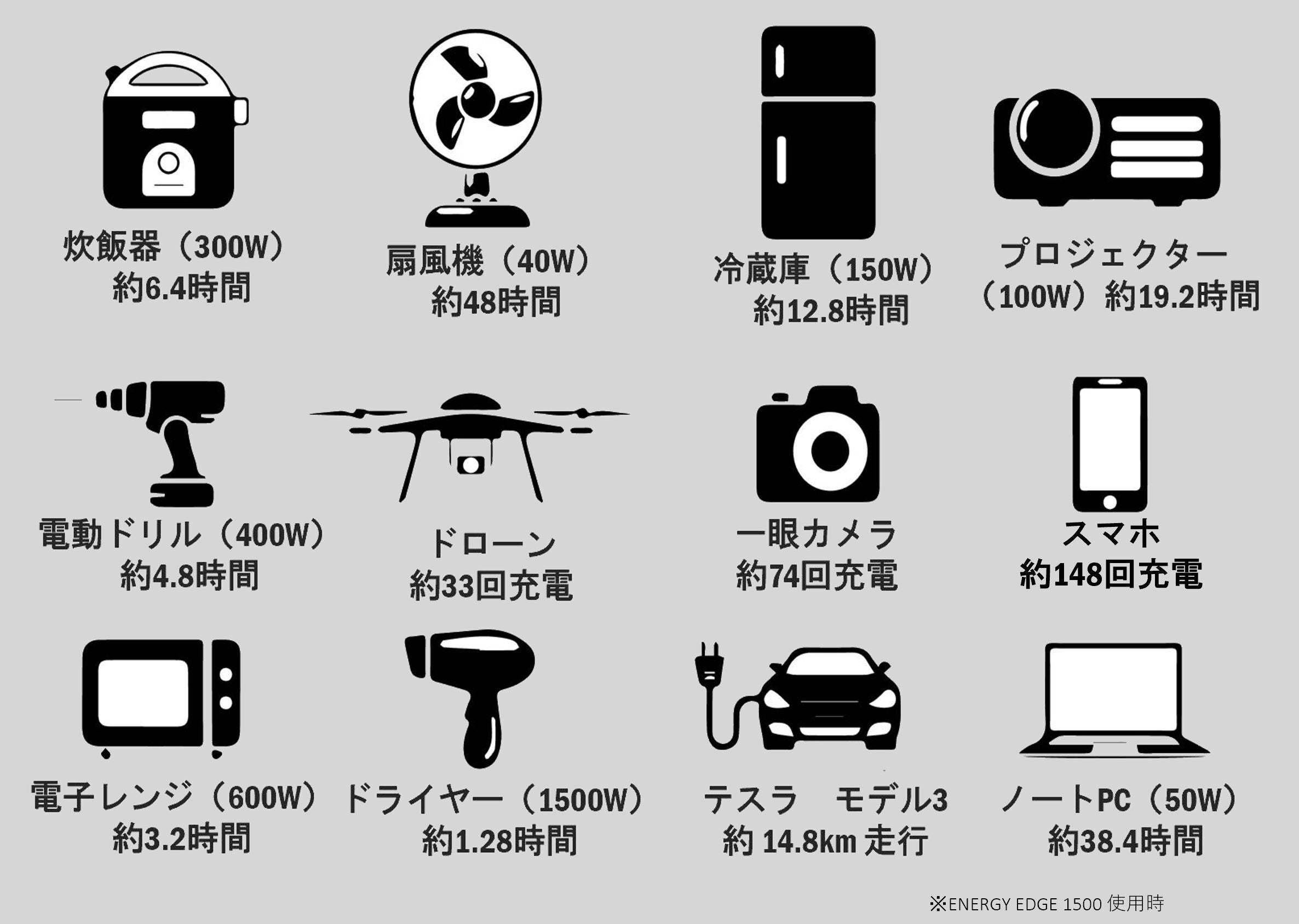 「EDERGY EDGE 1500」ではテスラなどの電気自動車への給電も可能で、17~19kmの走行できます。