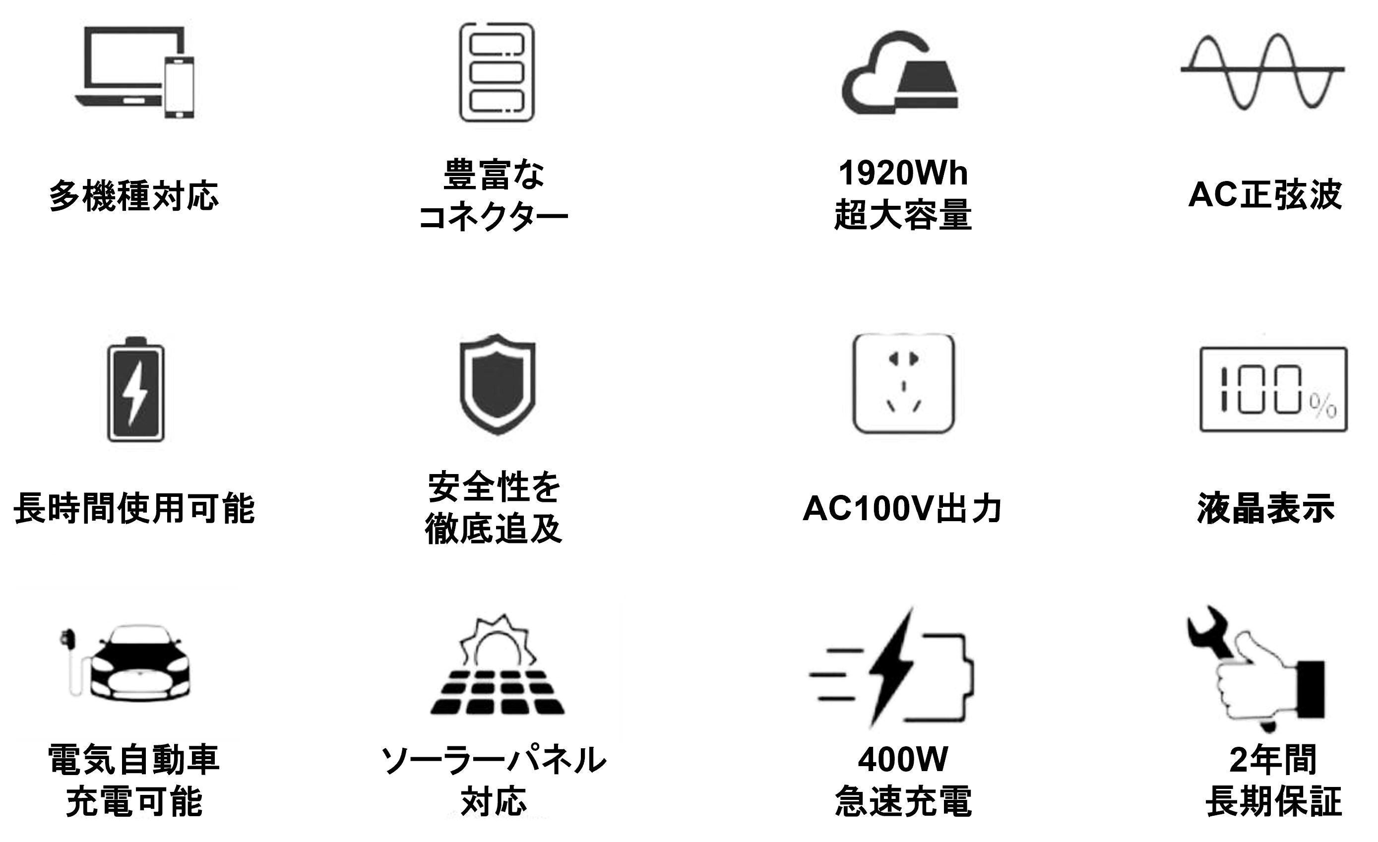 最大バッテリー容量は1920Whと国内最大級!冷蔵庫から自動車まで様々な電子機器に接続、長時間ご利用いただけます。