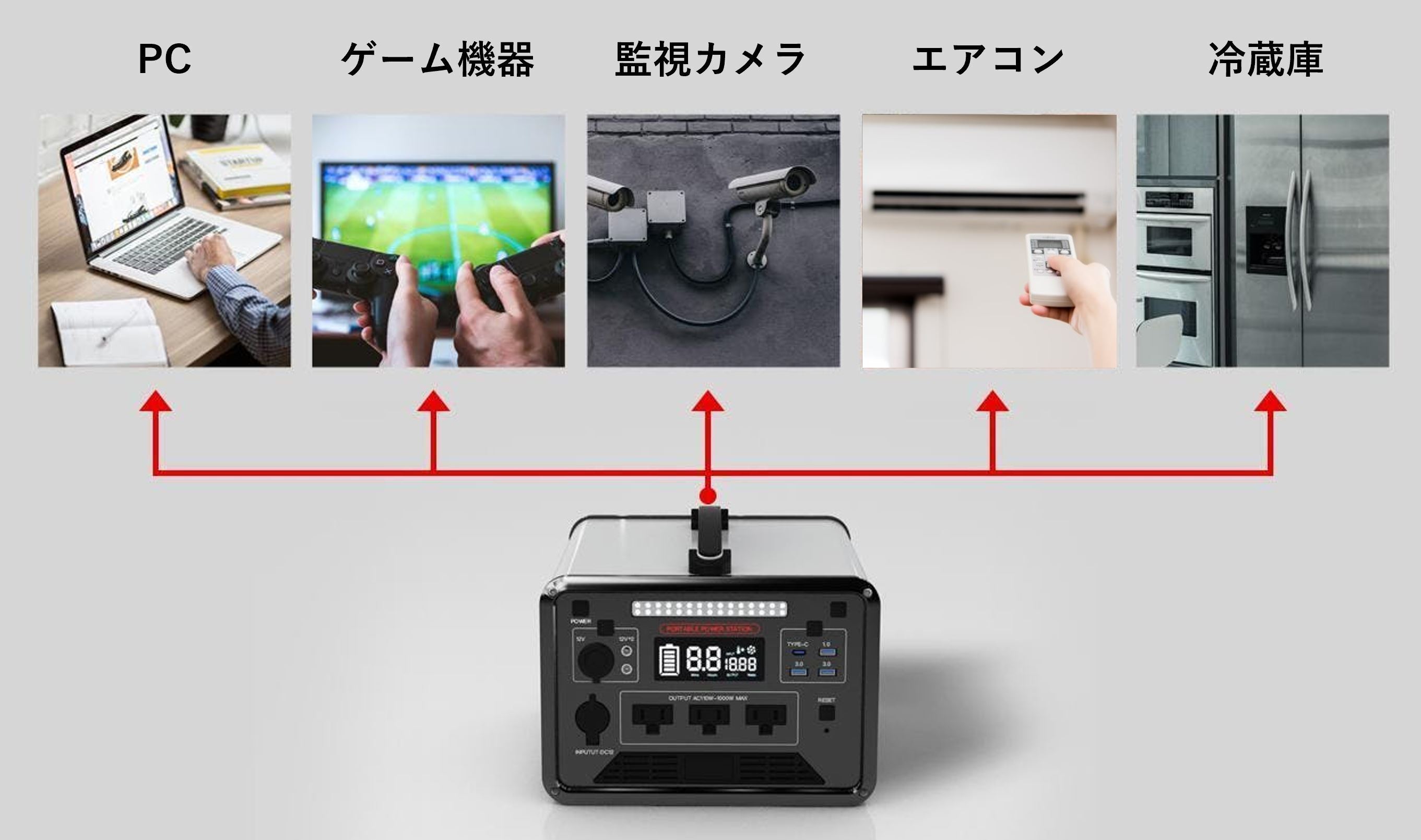 災害などで電力が遮断された場合でも、コンピューターやエアコン、ゲーム機器などに電気を供給し続けます。
