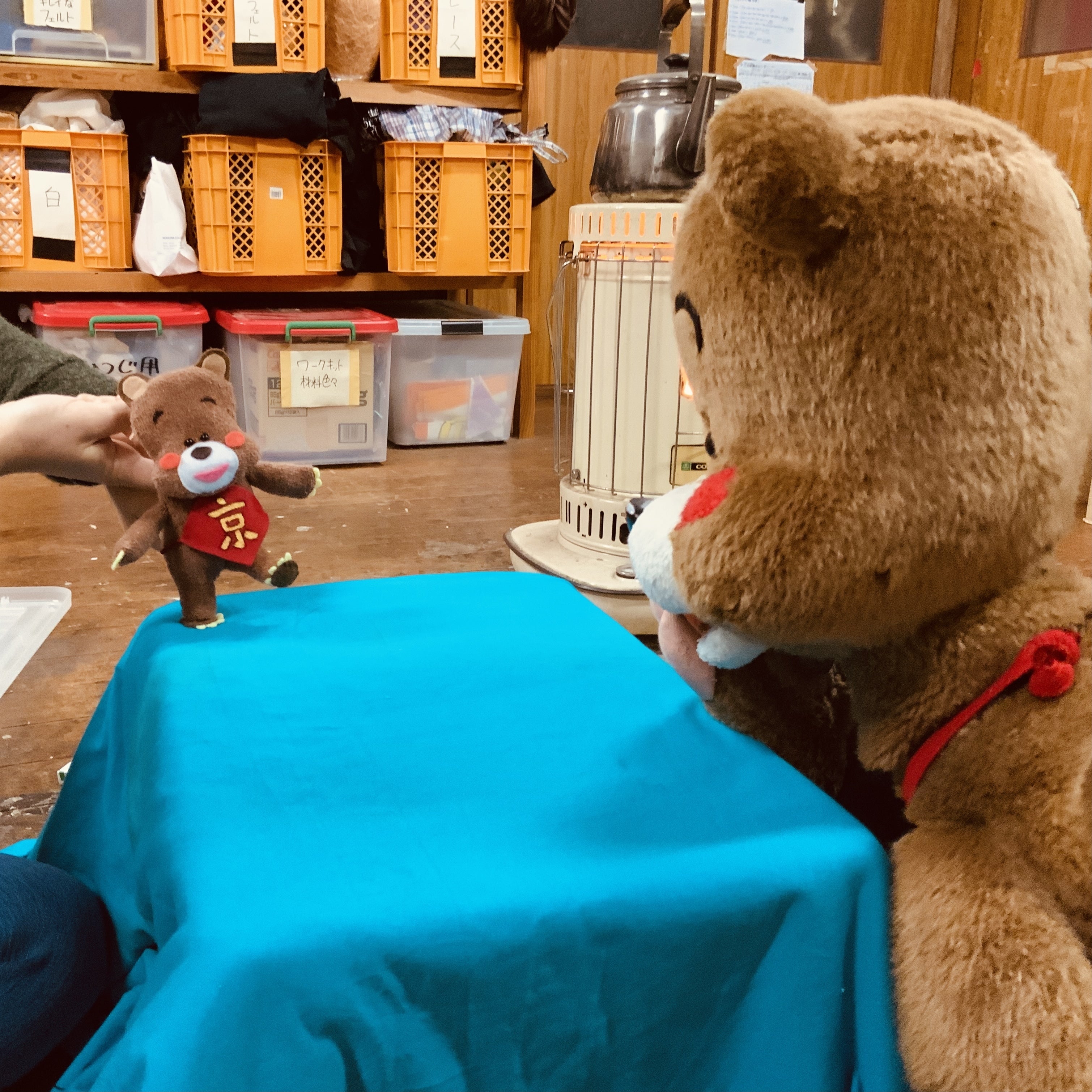 きょうべーは、私たち人形劇団京芸の公式マスコットキャラクターです。きょうべーは、劇団の大きなドングリの木に引っかかっていたのを団長に助けられて以来劇団に住み込んでいる5才のくまの子です♪