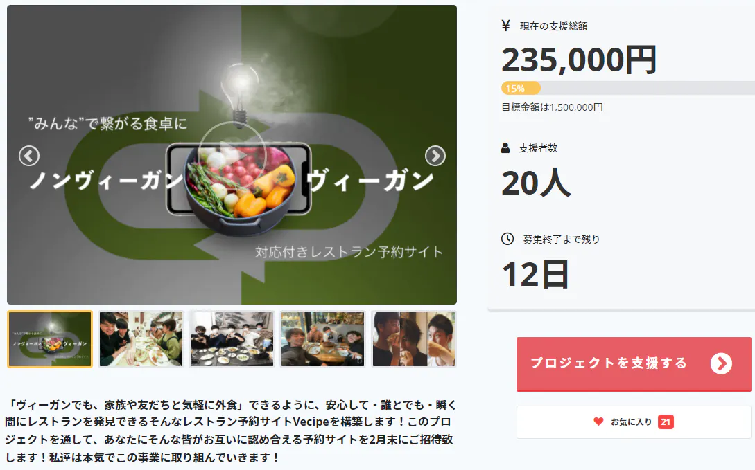 先日より、開始したVecipeクラウドファンディングにおいて、支援者数が20人を達成いたしました!本当にありがとうございます!我々が掲げる夢の実現に少しずつ近づいて参りました!