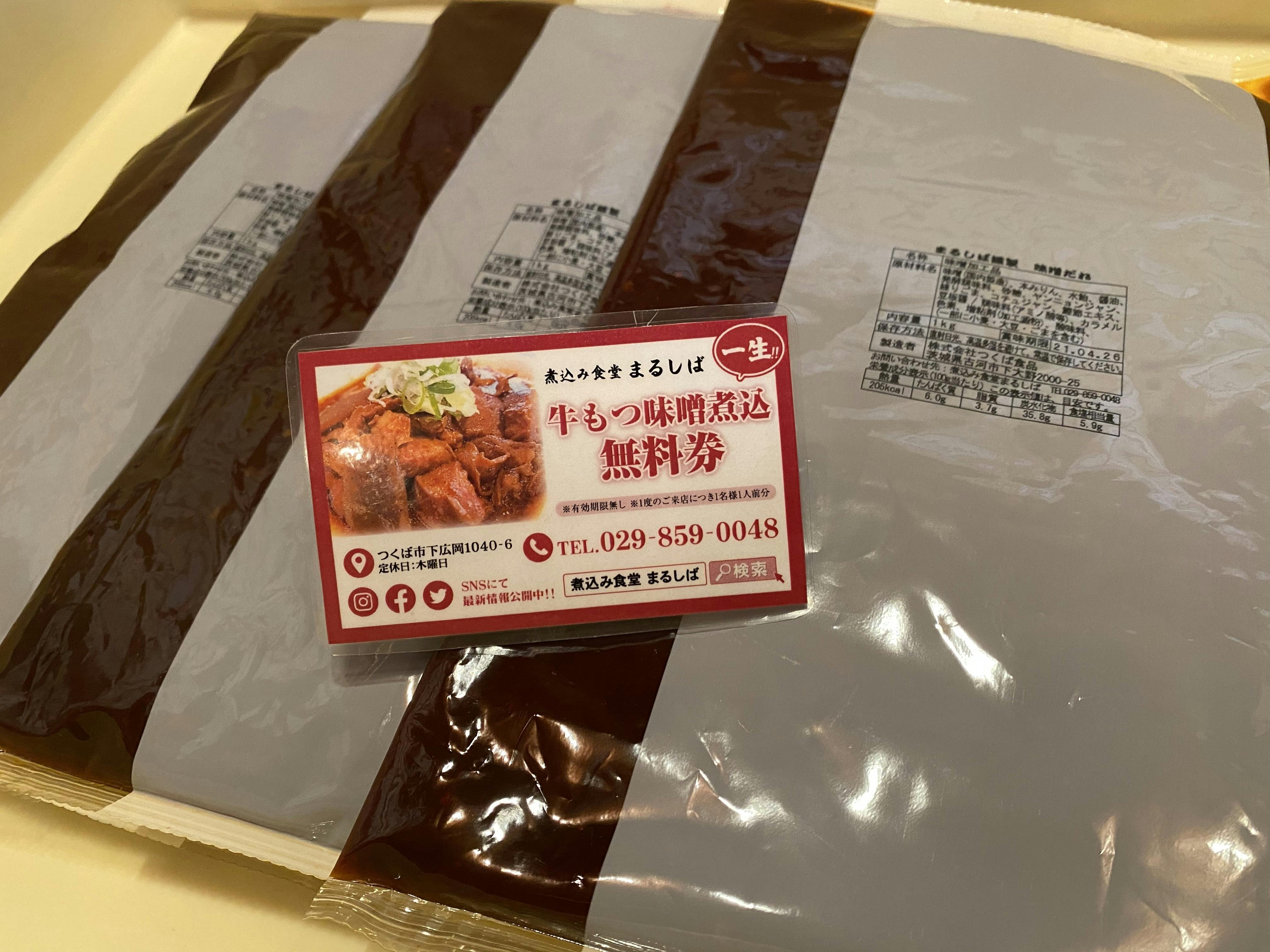 看板商品の牛もつ味噌煮込みで使用しておりますPBの煮込み味噌やまるしば本店でご使用いただける「一生サービス券」などをすぐにお送りいたします。