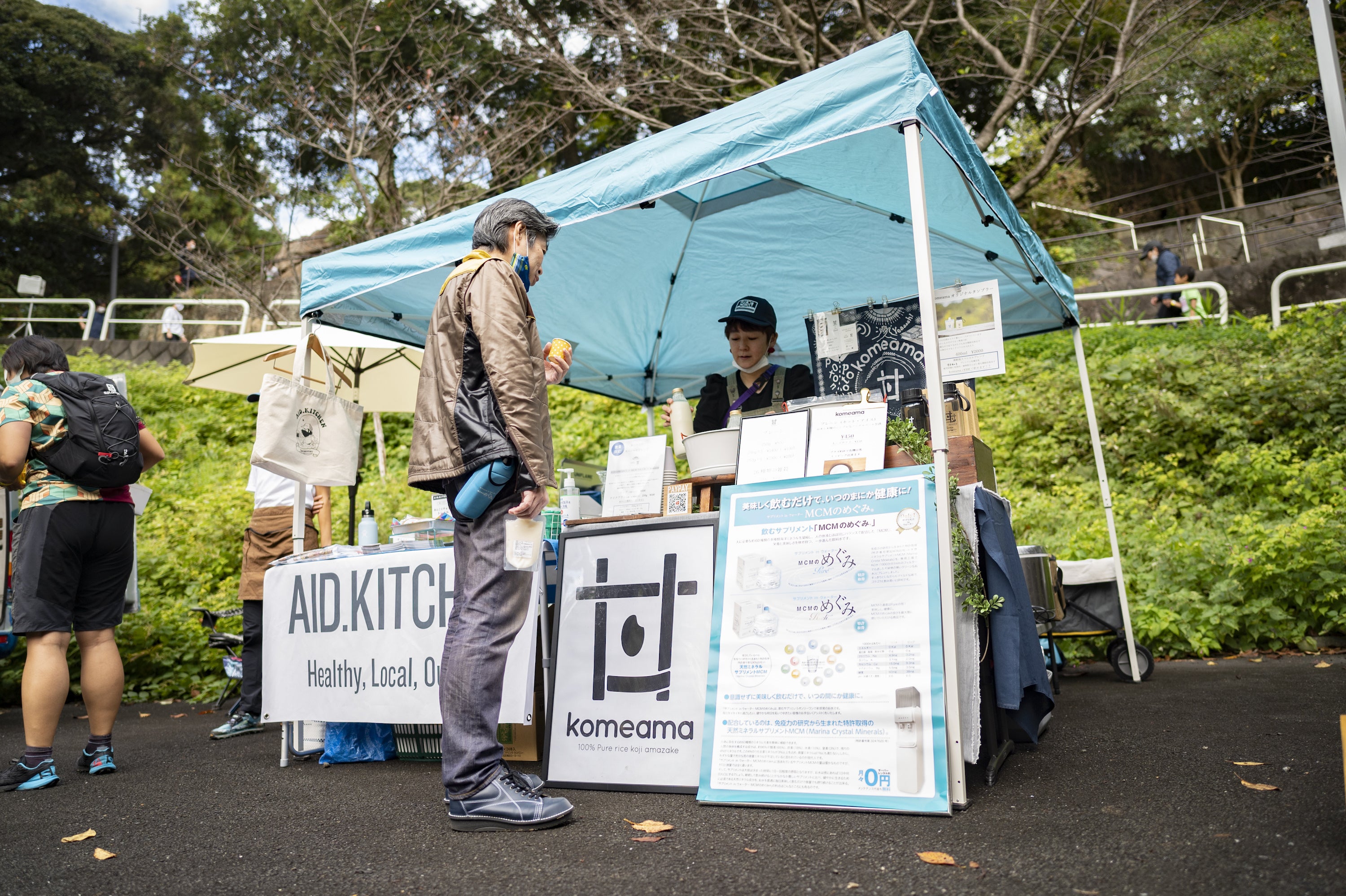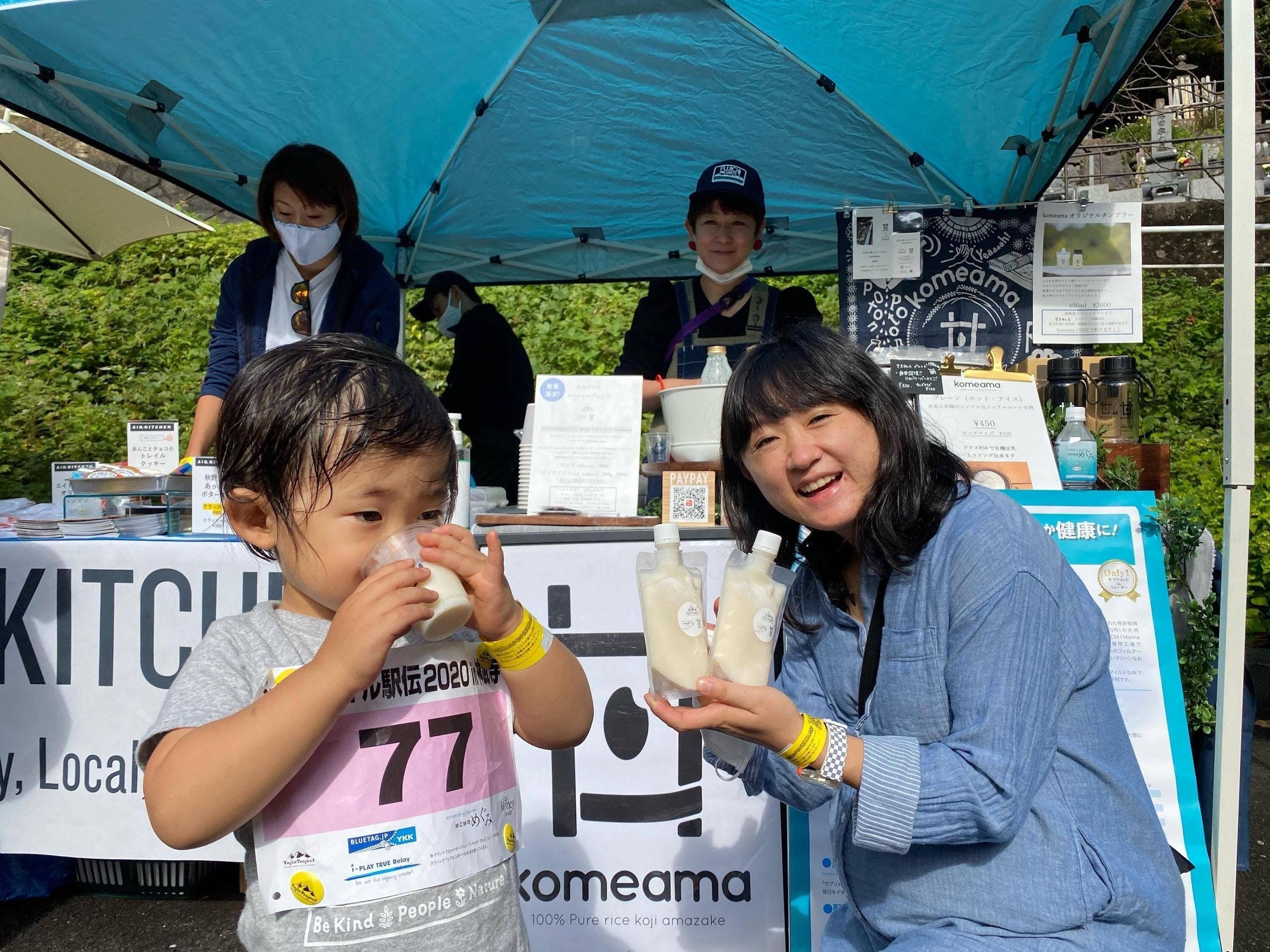 このコラボ甘酒は、2020年11月8日(日)に行なわれた、宮地藤雄さんのFujio Project主催のジュニアトレイル「逗子トレイル駅伝2020 in 神武寺」で限定販売をしてみたところ、40個弱用意したコラボ甘酒は完売。