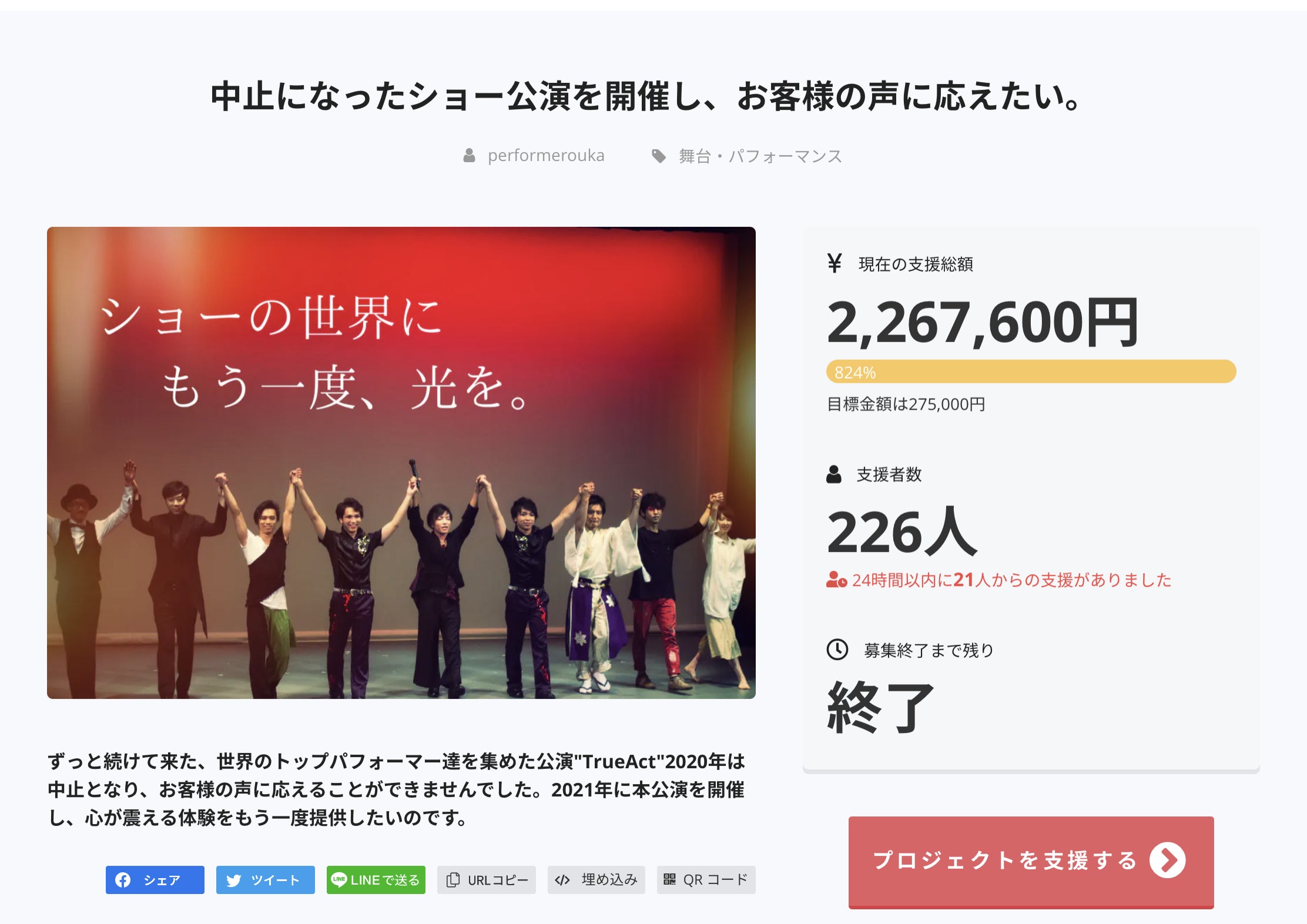 昨日24:00を持ちまして、本クラウドファンディングは終了しました。226人の支援者のみなさん、まことにありがとうございました!目標金額を大きく上回る824%のご支援、2,267,600円が集まりました。ですが、これは「終わり」ではなく「始まり」です。この資金・応援をもとに、TrueAct2021を運営・制作・開催していき、またグッズなどの製作にもあたります。これより支援者のみなさまには各種ご連絡をさせて頂きます。方法としてはcampfireのメッセージ機能を使用していきます。引き続き、どうぞよろしくお願い致します!2月に必ず良い景色をお見せします。