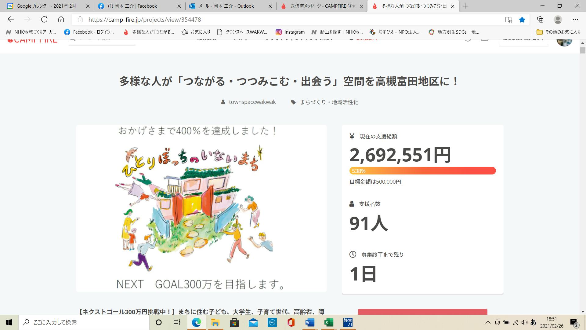 おかげさまで総勢139名の方(法人代行入金含む)から総額2,692,551円(538%)のご支援をいただいております。(2/26現在)