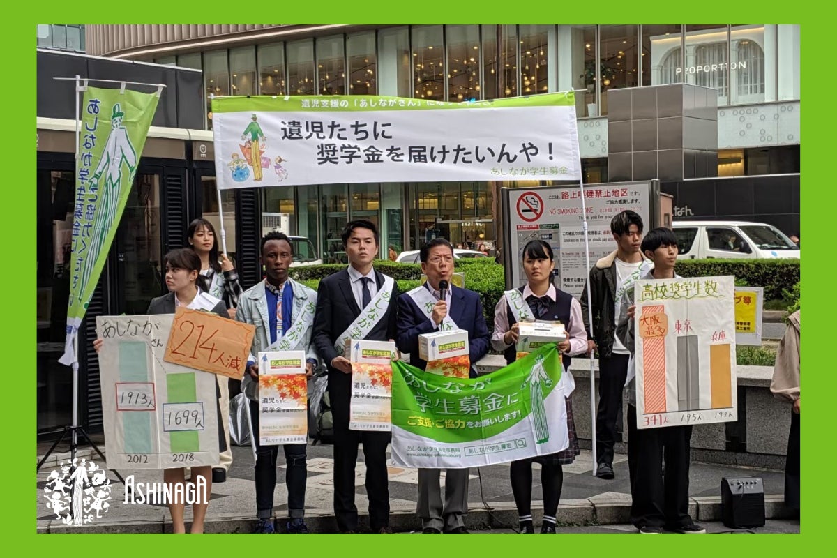 病気や災害、自死(自殺)などで親を亡くした子どもたちや、親に障がいがあり働けない家庭の子どもたちを支えている非営利の財団法人です。国などからの補助金・助成金は受けず、全事業を寄付によって運営しています。半世紀におよぶあしなが運動によって、これまでに11万人以上の遺児たちが高校・大学への進学を果たしてきました。 現在、日本国内では約6,500名(高校・短大・専門学校・大学・大学院)、サブサハラ・アフリカ教育支援事業では世界各地あわせて約120名の奨学生に奨学金支援(貸与・給付)と心のケア、リーダーシップ育成プログラムを提供しています。