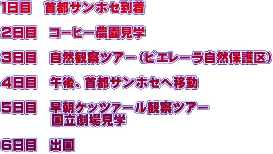 4泊5日のツアーでは今回のプロジェクトの主役であるピエレーラ自然保護地にてのご宿泊及び動物観察、場所を変えてコスタリカを象徴する鳥といっても良い、世界で1番美しい野鳥と言われているケツアールの観察、サンホセ市内観光など、短期間でコスタリカの自然と文化を満喫するツアーにご案内します。全行程、現地在住の日本語ガイドが同行、移動車両も、食事も付いています。