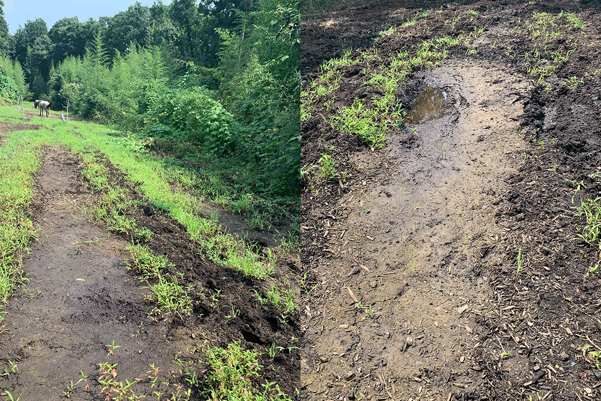 流鏑馬の稽古を行う走路:長さ180mの走路が2レーンありますが、こちらも放牧場と同じく水害にて浸食され、足首まで埋もれてしまうため、馬にとっても人にとっても安全で十分な練習ができない状況となっていましたので、こちらも土壌改良と土の入れ替えが必要な状況です。