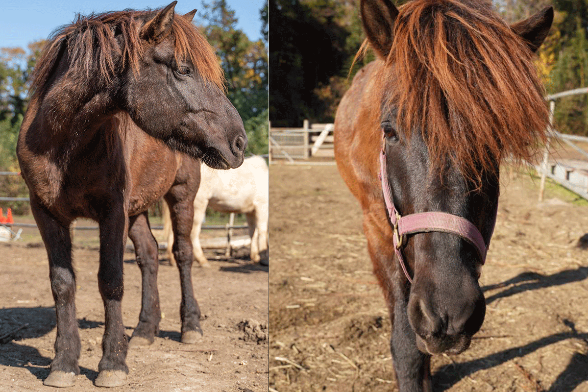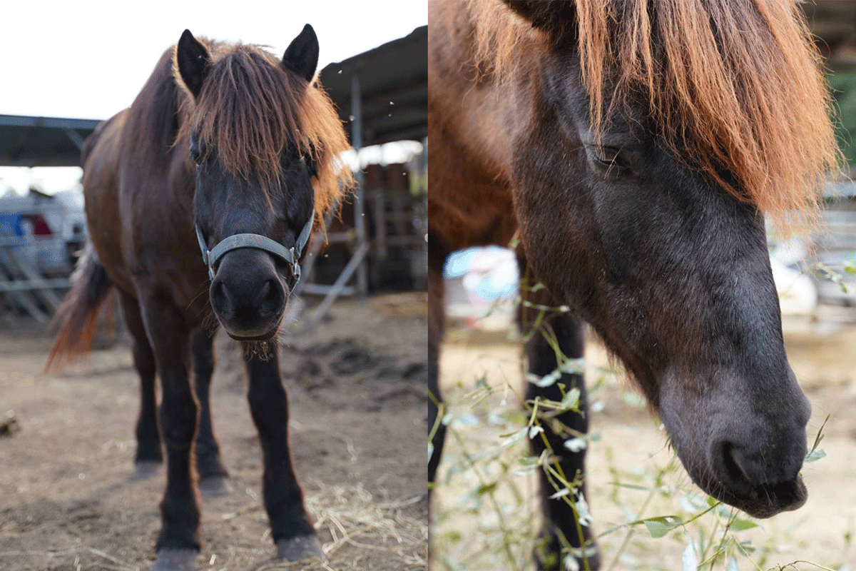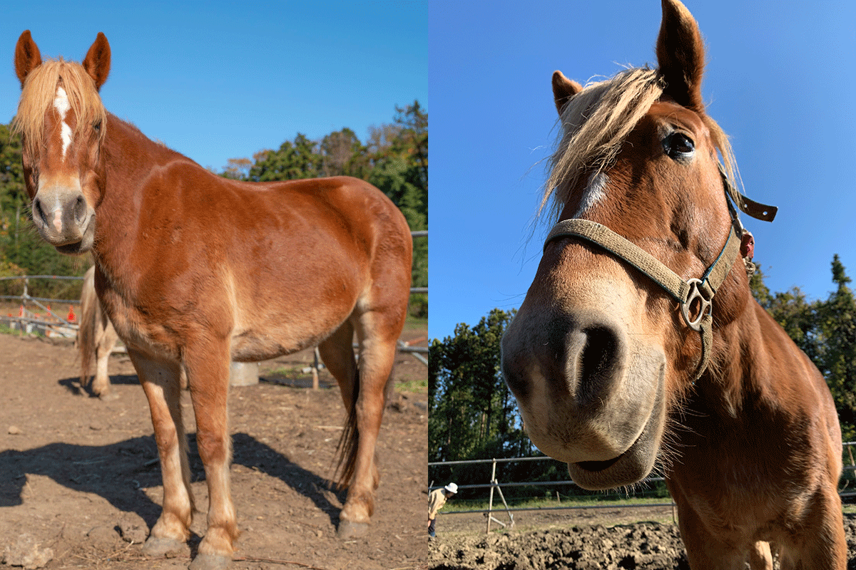 特徴:いかにも木曽馬!という体形と毛色が子供から大人気!何事にも動じない、初心者や子供まで安心して乗れます。でも、おばあちゃんらしからぬ、一番食いしん坊の富士ちゃん♪