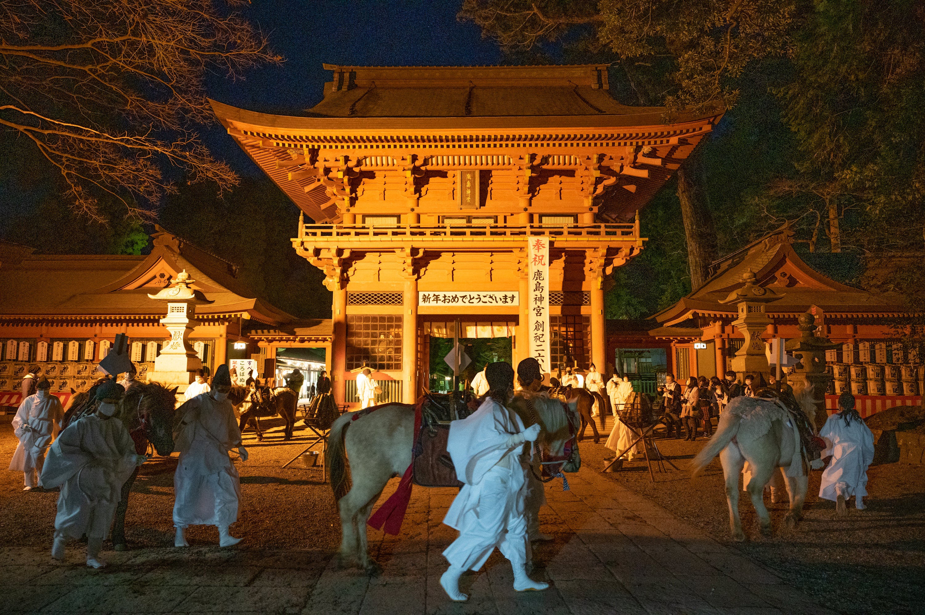 2021/01/11 21:16神様のお目覚めの祭事を「白馬祭(おうめさい)」といい、鹿島神宮の白馬祭は,約750年の歴史を持つ伝統的な祭事です。当会は、16年前からこの行事に参加しており、当会の在来馬たちは「御神馬召立之儀」において、お祓いを受けることにより御神馬(ごしんめ)となります。 祭事が始まると,蹄の音が境内に響き渡り,神殿の前を御神馬(ごしんめ)が駆け抜けます。古くは、「年のはじめに白馬を見れば年中の邪気を祓う」という言い伝えがあり、近年では、御神馬にハンカチを踏んでもらうと願いが叶うという民間信仰があることから、毎年たくさんの参拝者が御神馬の通り道にハンカチを並べて踏んでもらうのを待ち、行事を楽しんでいます。 今年は、コロナ禍の影響により、規模が縮小されたものの、幸いなんとか開催されることとなりました!参考:茨城新聞https://ibarakinews.jp/news/newsdetail.php?f_jun=16100205415917ここからは、当日の様子をどうぞ!〇 さあ、牧場を出発です!〇 今日はどこにいくのかな~?〇 鹿島神宮に到着した後、馬たちを鹿島神宮の雰囲気に慣れさせるために、一緒にゆっくりと歩きます。〇 午後6時に白馬祭が始まりました!楼門前で周回して、「御神馬召立之儀」を待ちます。(ちなみに、写真に写っている楼門は、高さが約13メートルある日本三大楼門の一つといわれ、重要文化財に指定されており、とても立派です!)〇 一番御神馬の「白星」から一頭ずつ「御神馬召立之儀」において、お祓いを受けます。その後、いざ境内へ!〇 御神馬の曳き回しのスタートです!ここから人馬共に一緒にゆっくりと走り出します!〇 ここは、例年であれば、砂利の上にたくさんのハンカチが並べられ、御神馬に踏まれるか!?と盛り上がりを見せる場面です!〇 みんな、本当によく頑張ってくれました!!(写真では見えませんが、エサには大好きなニンジン入りです!) もっと見る