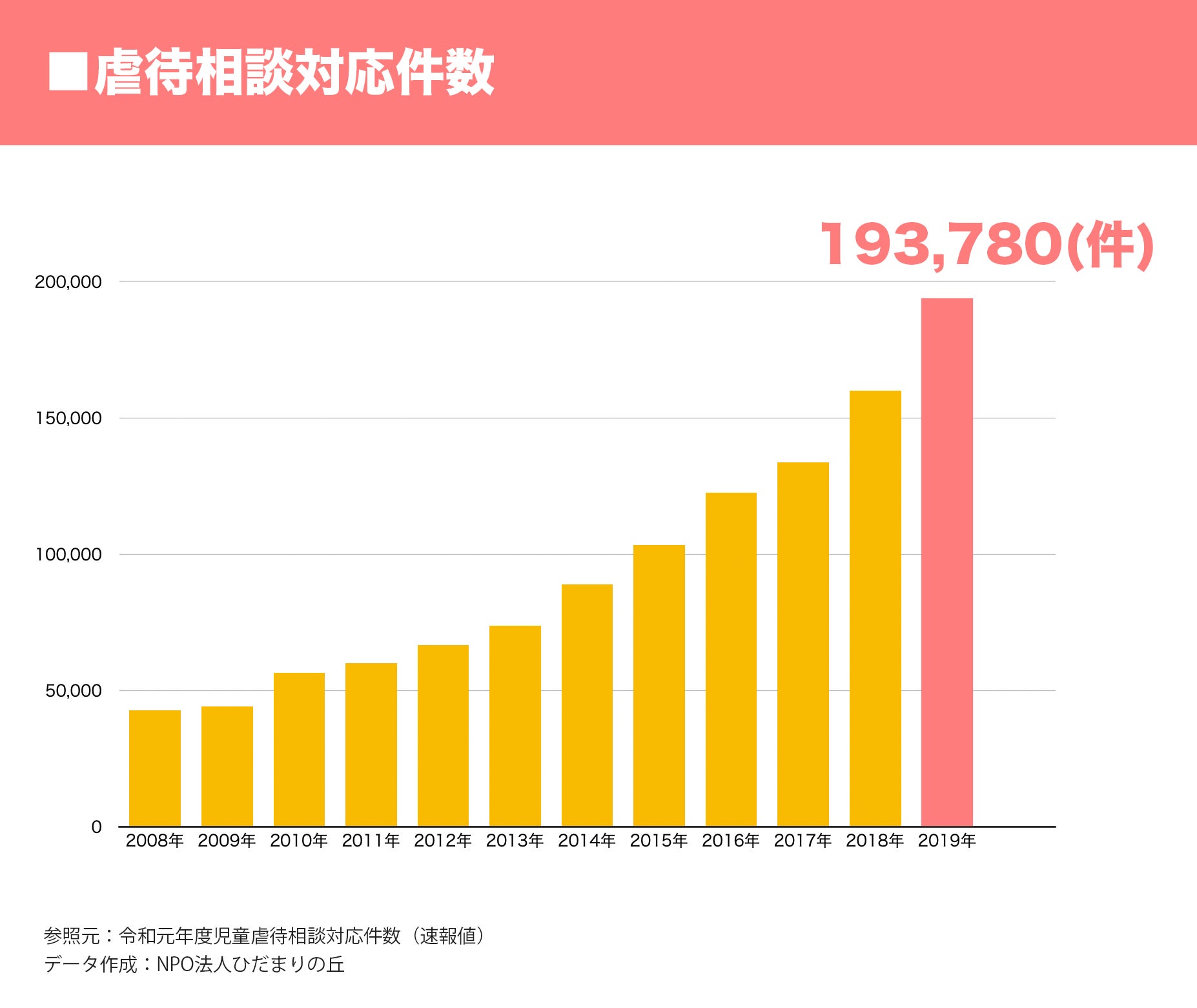 「児童虐待報告相談件数」(※児童相談所等対応した件数)2019年時点では過去最多を更新。この増加傾向が必ずしも悪いわけではなく、虐待が「表面化してきた」ということだと考えています。①2006年に配偶者間の暴力(面前DV)が心理的な虐待になること(児童虐待防止法の改正)②2013年に警察がDV事案などへの積極的介入(体制の強化)③通報、相談ダイヤルが10桁から3桁「189」に。また痛ましい事件などの報道もあり徐々に社会全体の意識も変化したことが増加した要因だと考えられます。このグラフは「相談・対応の件数」であって、虐待が起きている正確な数、その起きる背景については完全にはわかっていません。
