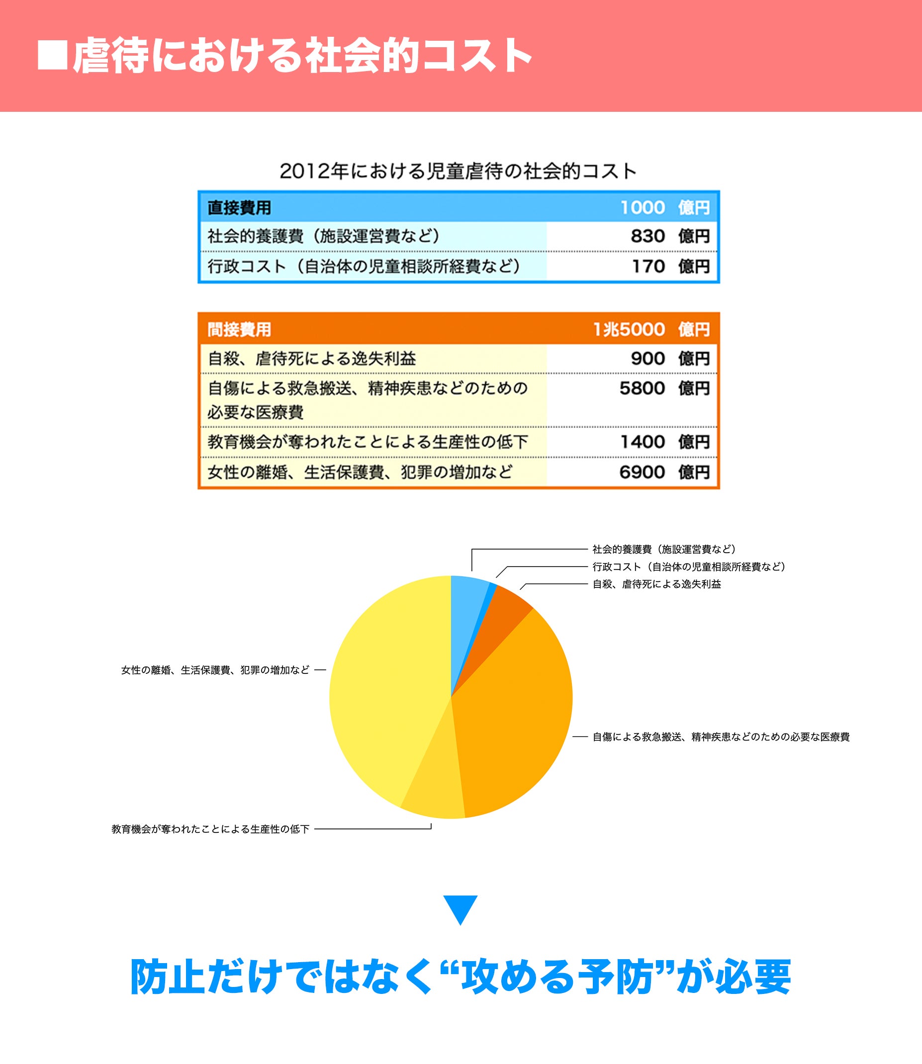 2012年に、虐待をコストとして視える化するための調査研究が行われました。乳児期〜未就学児で死亡するニュースがありますが、事件や通報するよりもっと早い段階で、虐待が起きないような取り組みを広げていかなければなりません。