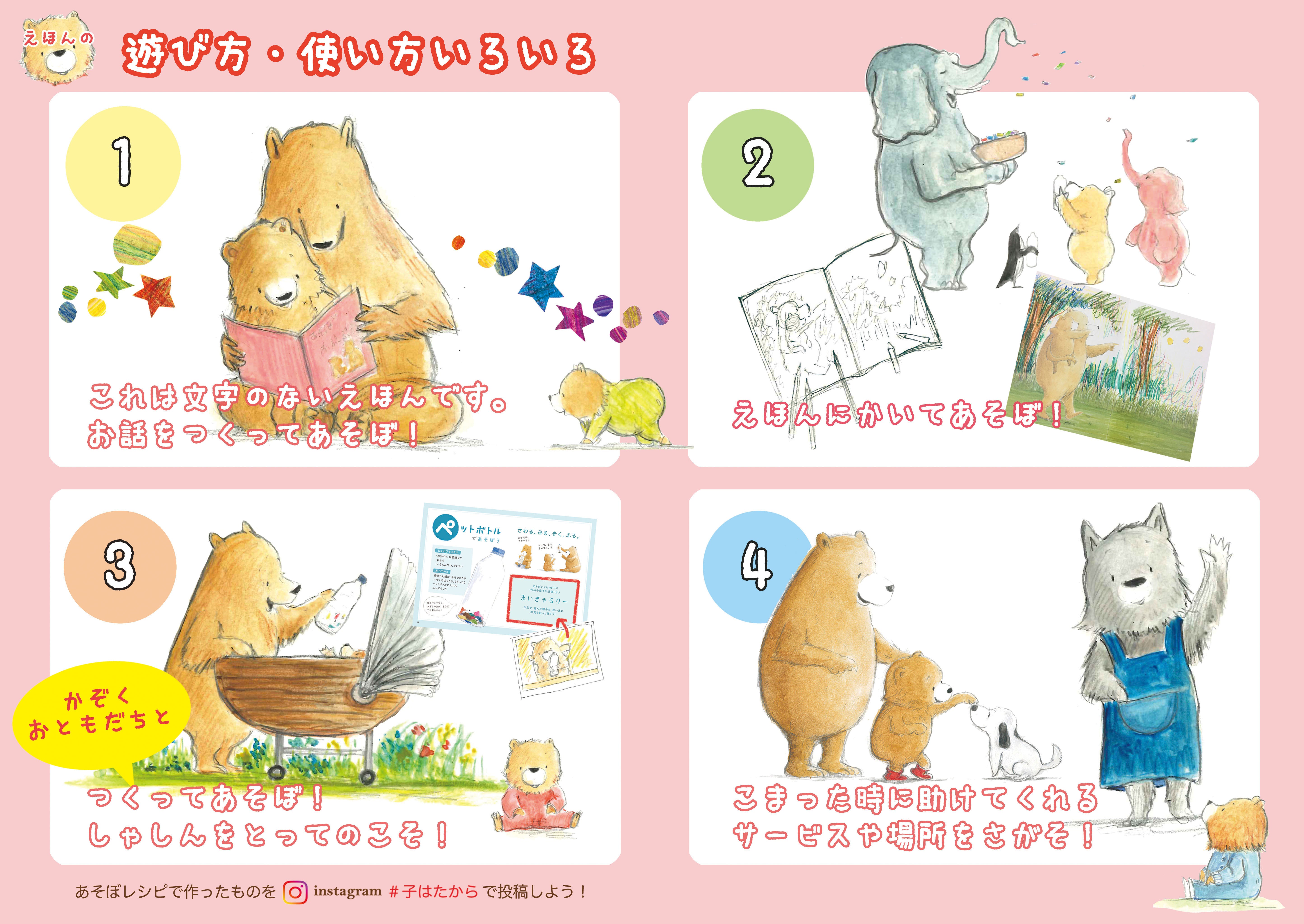当団体では、3年前からなるかわさんの絵本をつかったワークショップを開催しています。毎日、ママが口にしてしまう言葉「そんなことしちゃダメ!」「よごれちゃうじゃない。」「もっとこうしなさい!」とつい言ってしまいそうになりますが、この日だけは、ママたちにその言葉を封印してもらい「今日は、親のやりたいことをさせるのではなく、こどものやりたいことを優先させてくださいね」と伝えます。子どもたちが、思ったように描き、感じたままに塗る。「自由に、心のままにあそばせてあげてください」それが「あそぼ」シリーズの絵本を使ったワークショップのコンセプトだからです。紙をびりびり破る子、紙を食べちゃう子、ずっとクレヨンでぐるぐる描いている子、ペットボトルにクレヨンを入れちゃう子。いろんな子がいますが、いつもは叱られそうなことでも、自由にやらせてもらえると驚くほど集中してあそんでいます。絵本の中には、身近なものをつかった「あそぼレシピ」があり、いつでもおうちの中でできる「あそび」のヒントがつまっていて「遊びに連れて行かなきゃ」「子どもと遊ぶためにはおもちゃが必要」・・と思っているママが「身近にあるものでこんなに夢中になって遊べるんだ」と驚かれます。「あそぼ」シリーズの絵本にはセリフがありません。でも、見るだけで心がなごむあたたかい絵があふれています。子育てに行き詰まって、つい怖い顔になってしまっているママが、手にするだけでほっこりするような絵本。ちょっと手を休めて、子どもと遊ぶ時間を作れるような絵本。そして、この絵本には「子どもとぴったり寄り添える時期を楽しもう」「ひとりで悩まないで」「時には地域のたすけびとに頼ろう」というメッセージもこめられています。疲れたときや「ちょっと、一人じゃ無理・・・」と思ったとき、この絵本を手に取ってもらえますように。「ちゃんとしなくっちゃ」といつも気負っているママにも、ほっこり笑顔になれる時間を作ってほしい。そんな思いを込めて、これからもワークショップを続けていきます。