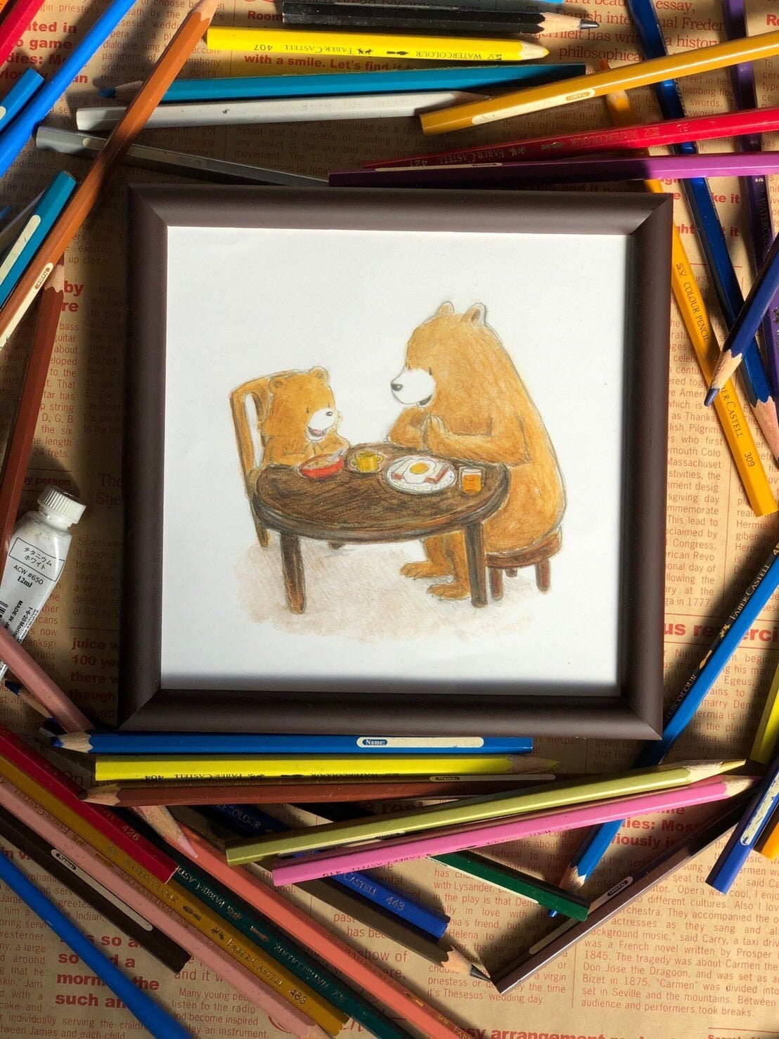 あなたやあなたの家族写真をいただき、イメージを膨らませて登場するくまと一緒に絵を作成します。1つずつ丁寧に仕上げますのでお時間をいただきます。※似顔絵制作ではありません。(※1)原画サイズ目安A4横(210mm×297mm)マット紙・額付(※2)額・マット紙付になりますのでA4より一回り大きいサイズになります。