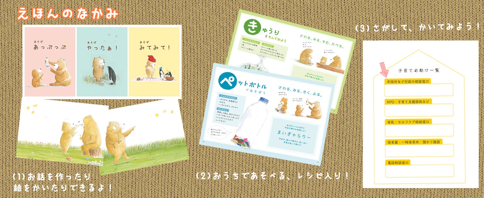 安心して前向きに親子関係を深める遊びの紹介や、関わり方のヒント、支援者との関係づくり、支援を受けられる環境づくりをお手伝いするツールとして、子はたからプロジェクトの「あそぼレシピ」絵本セットをプレゼントしています。※赤ちゃん訪問時の保健師からの直接案内や、子育て支援拠点(広場)のイベントなどで利用されています。