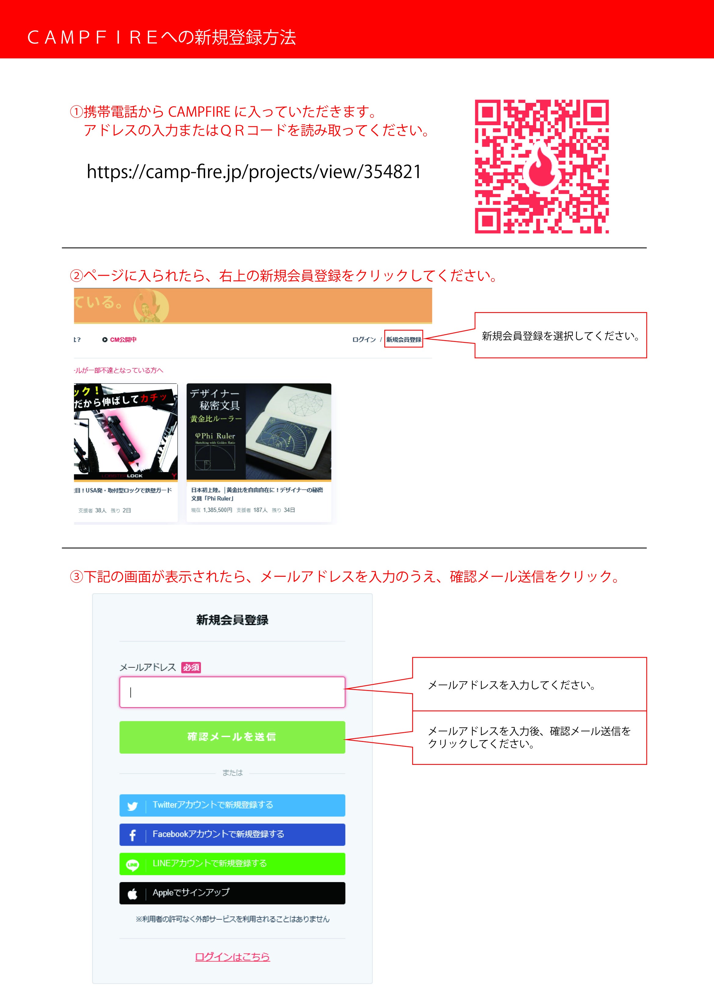 また、ご支援者の方々へCAMPFIREへの新規会員登録の手順方法をA3版 3ページに簡単にまとめた資料を作成し、ご来店いただいたお客様に活用いただけるようにしました。