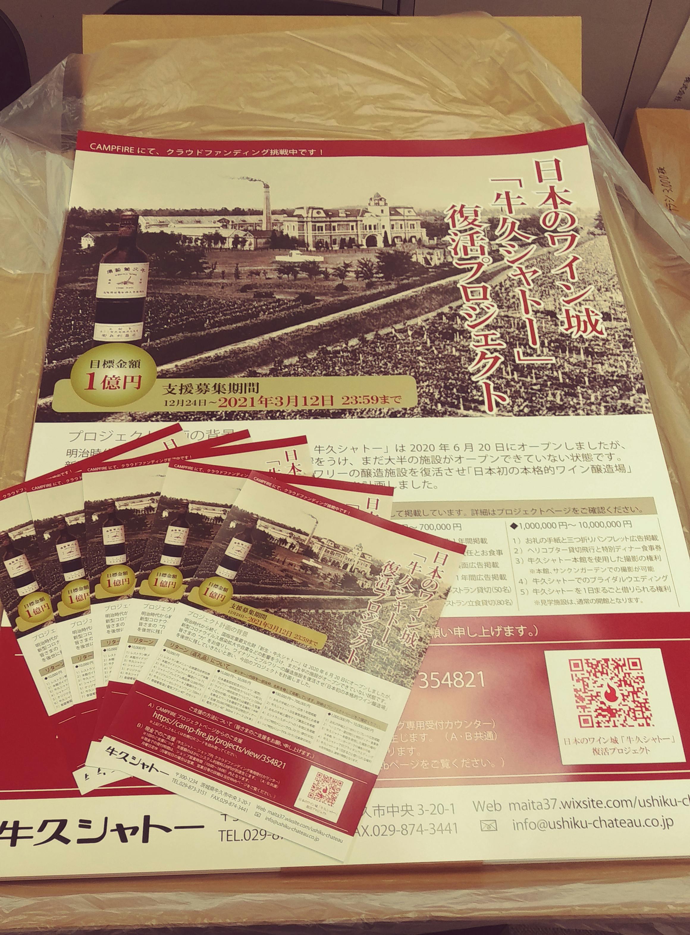 本日から現行の印刷物のほか、納品されたチラシやポスターを牛久シャトー内の店頭などに設置しました。